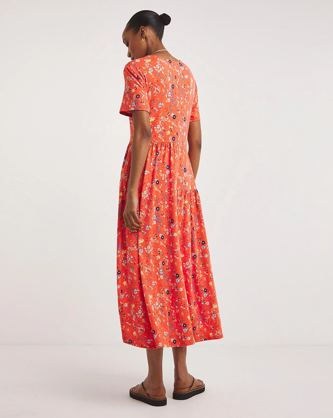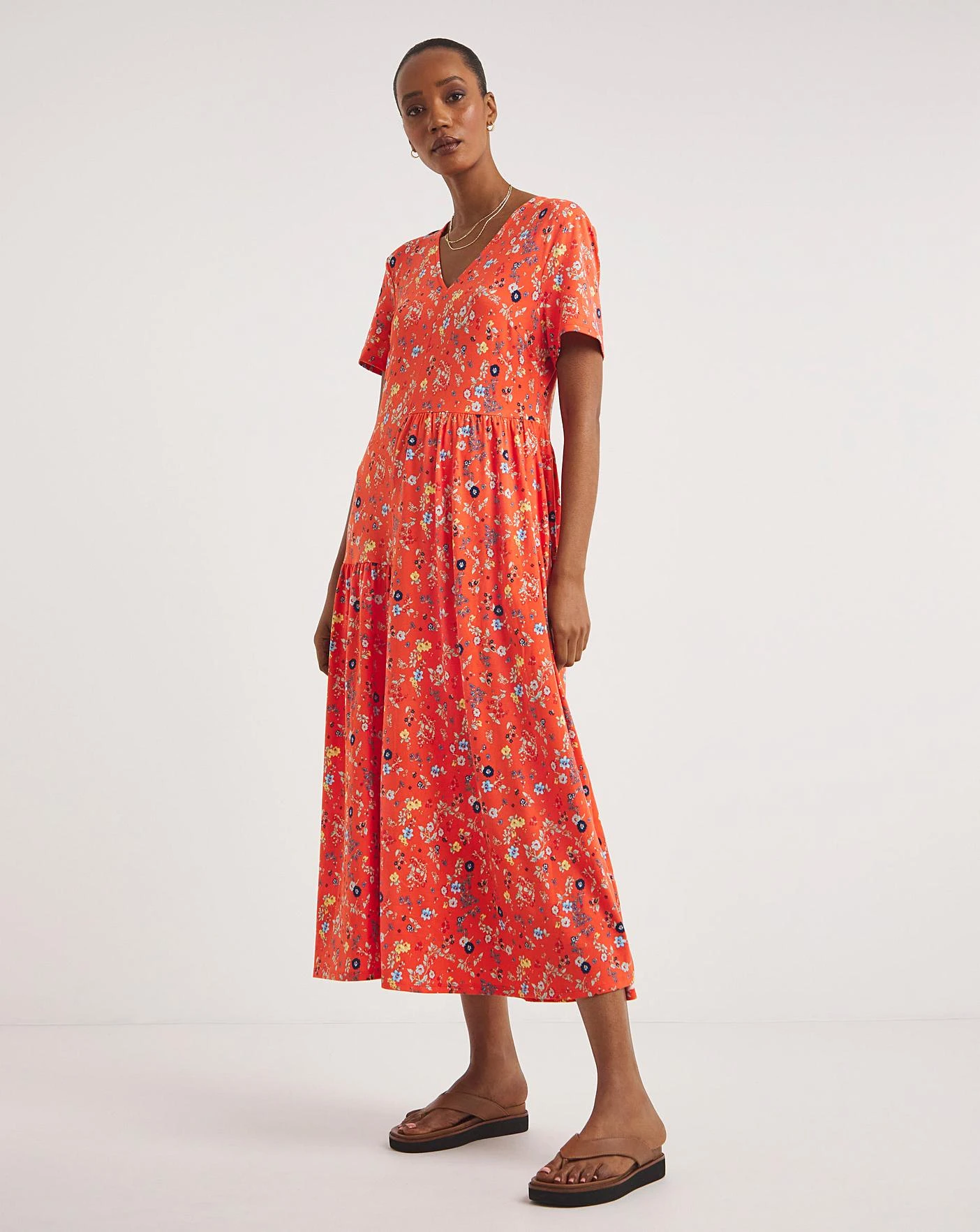 Our bestselling swing dress shape is crafted from a beautiful sustainably sourced viscose and is perfect for spring days. Featuring a pretty asymmetric hem, deep V-neck and short sleeves. In our maxi length, style with sandals the perfect seasonal look.