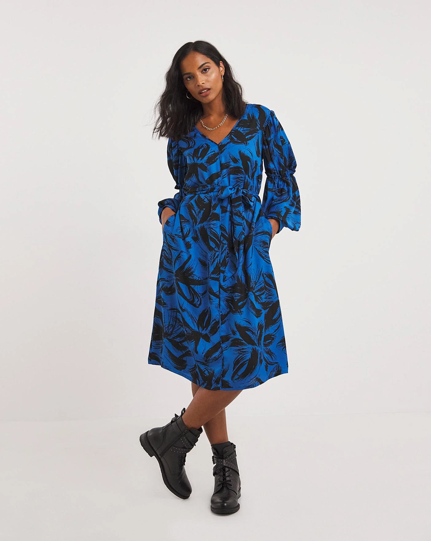 An essential staple for any day styling, this blue and black print dress features a V-neckline, balloon frill sleeves with deep cuffs adding sophistication and a detachable tie waist belt. Complete the look with your favourite pair of boots or dress up with heels.