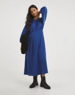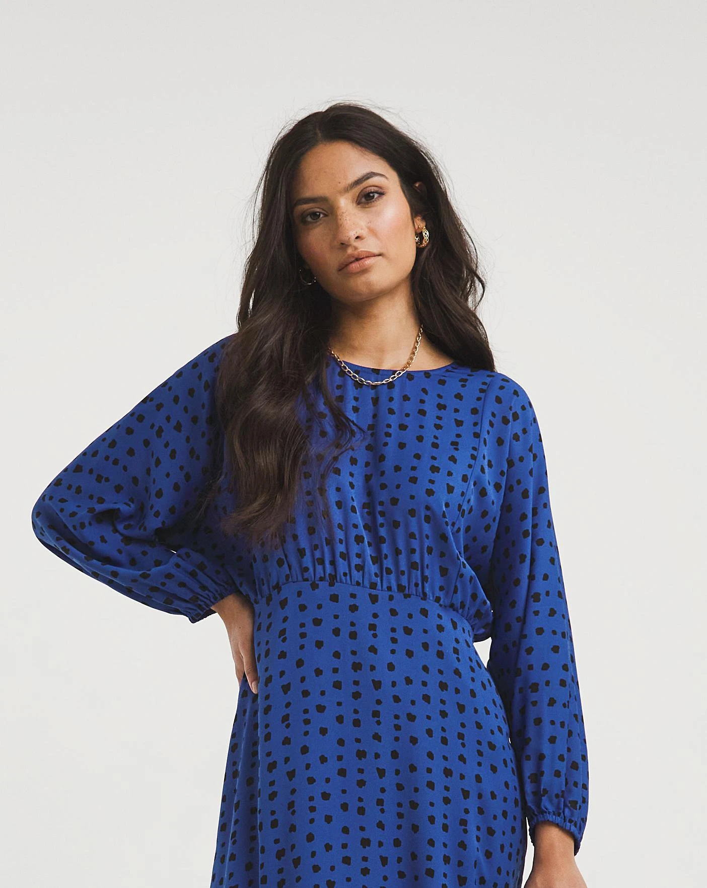 Elevate your wardrobe this season with this high neck midi tea dress. Featuring a high ruched waist seam with back elastic, a keyhole at the back of the neckline with a small button making it easy to slip in and out of the dress and balloon sleeves with elasticated cuffs. Designed in a deep blue and black print, perfect for day or night occasions.
