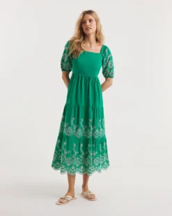 Broderie Tiered Dress With Puff Sleeves| Green/Ivory