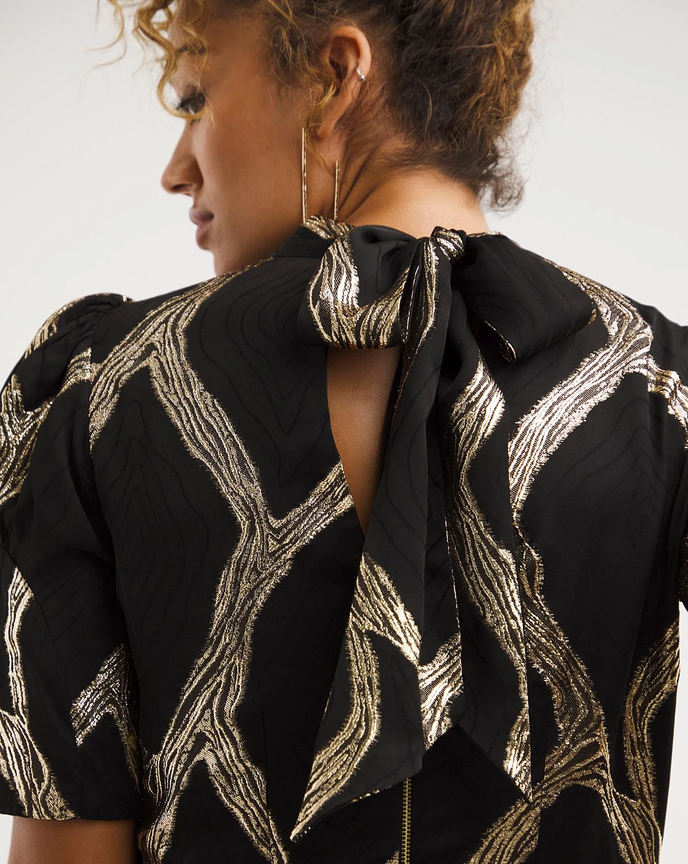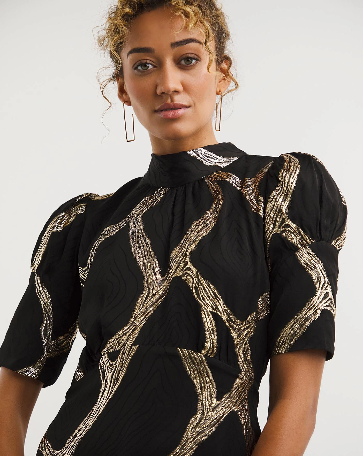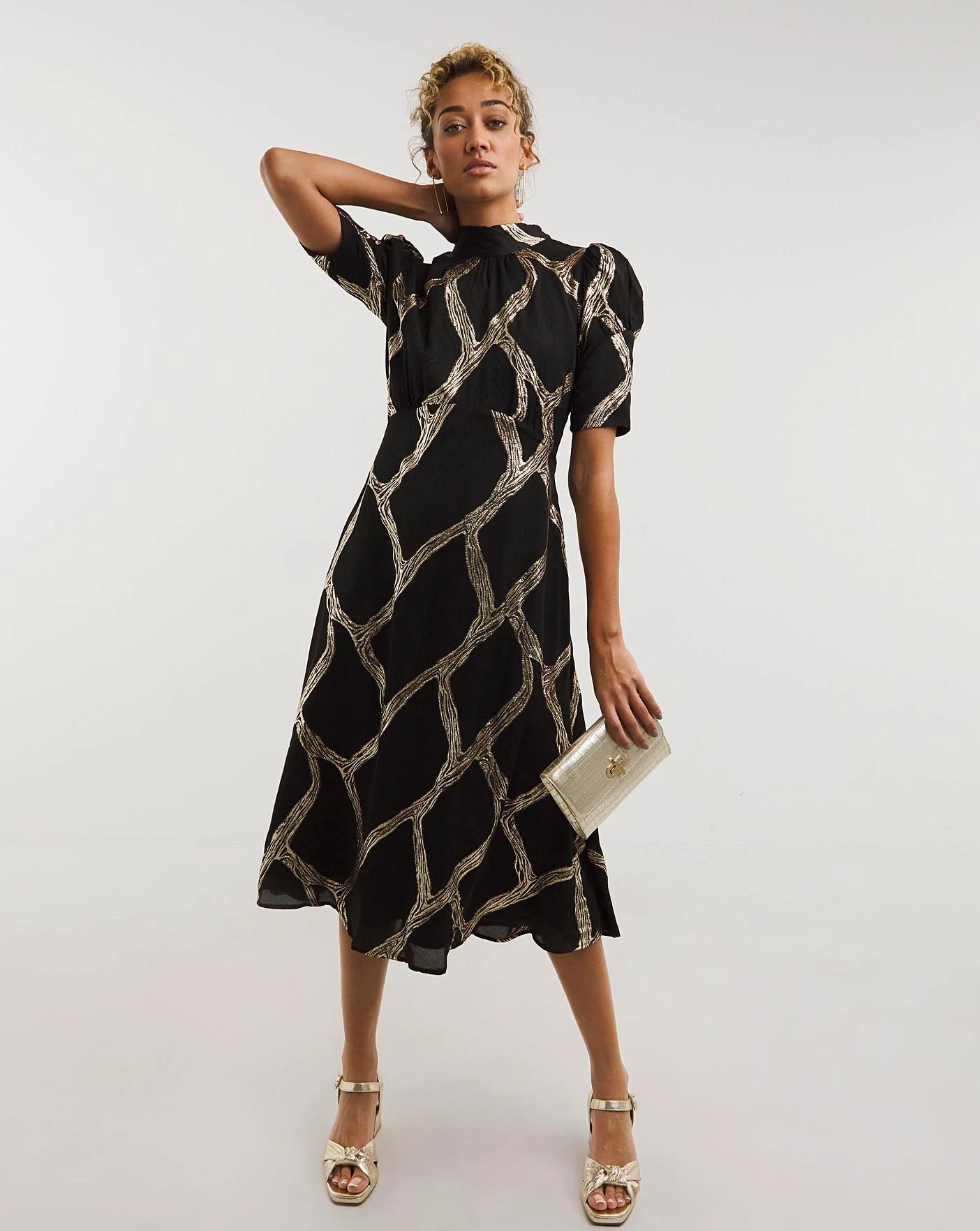 A best selling shape with a luxurious spin on, with the Gold design woven in, this high neck dress is perfect for the party season.