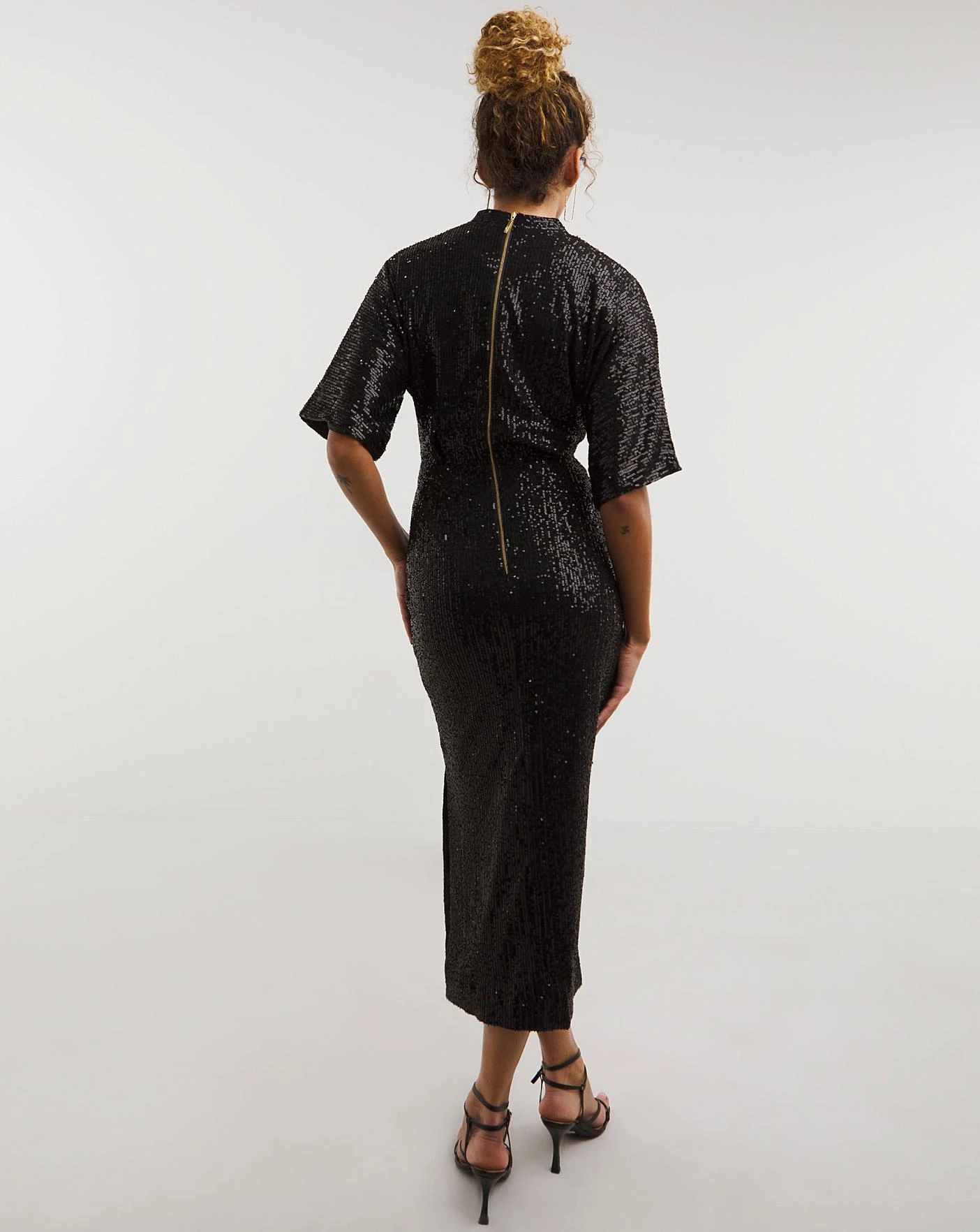 A fully lined kimono penci dress cut v neck detail & statement purple sequin.