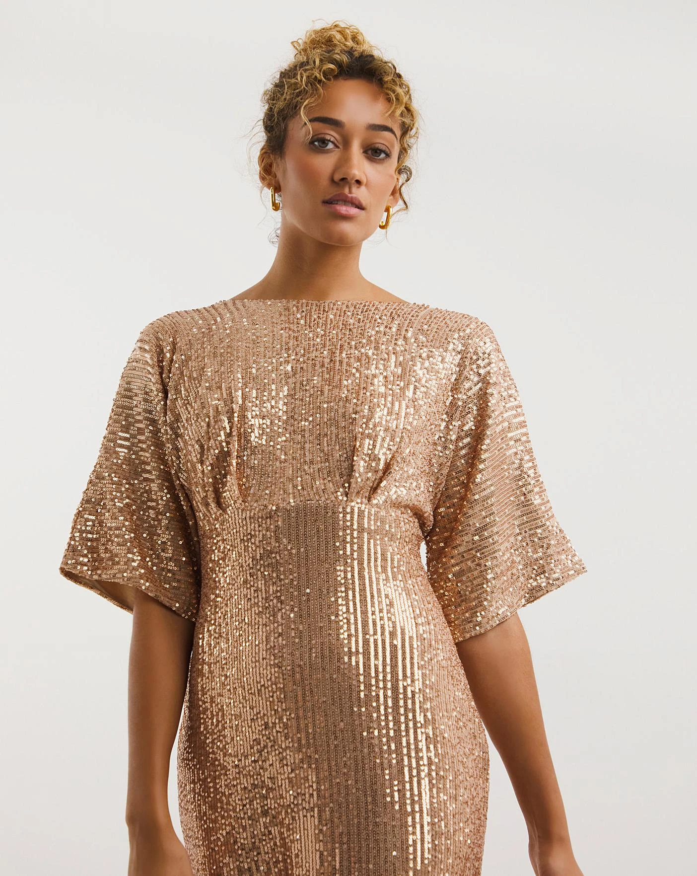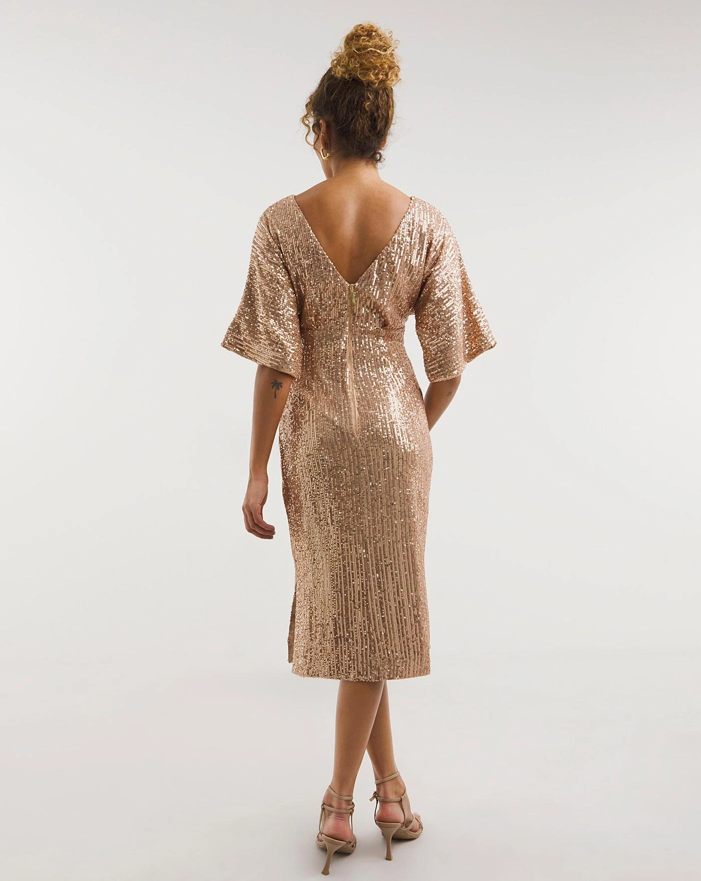 Rose Gold Sequins shimmer softly on this fully lined kimono style dress. With side pencil skirt and v back detailing.