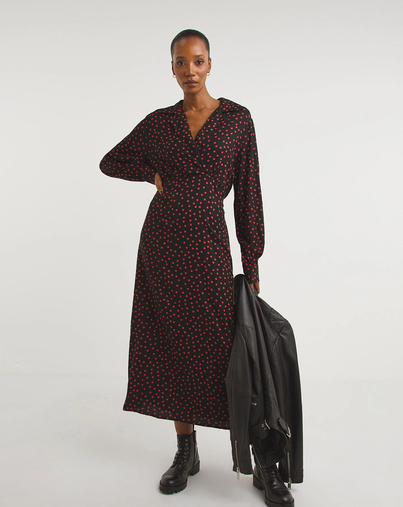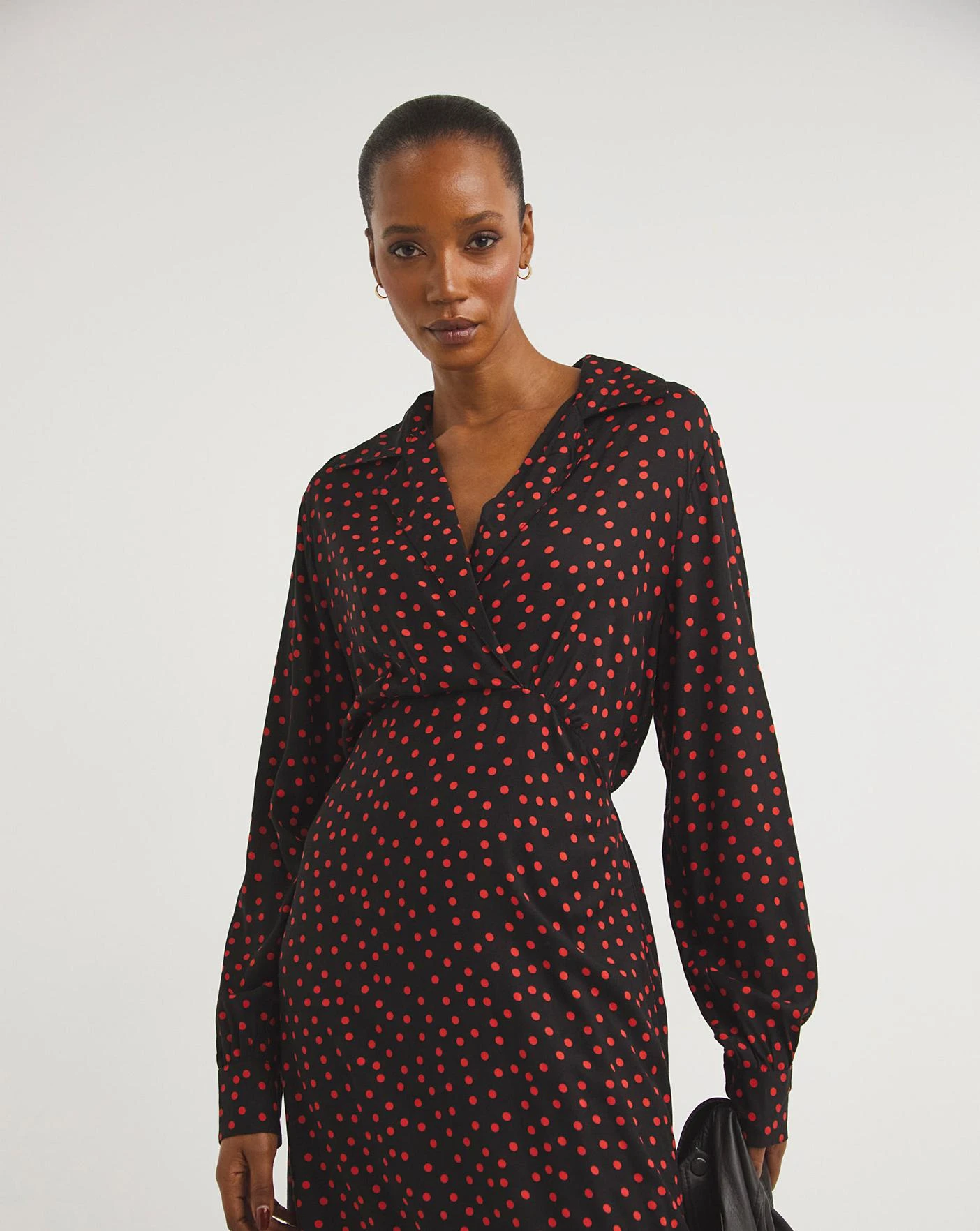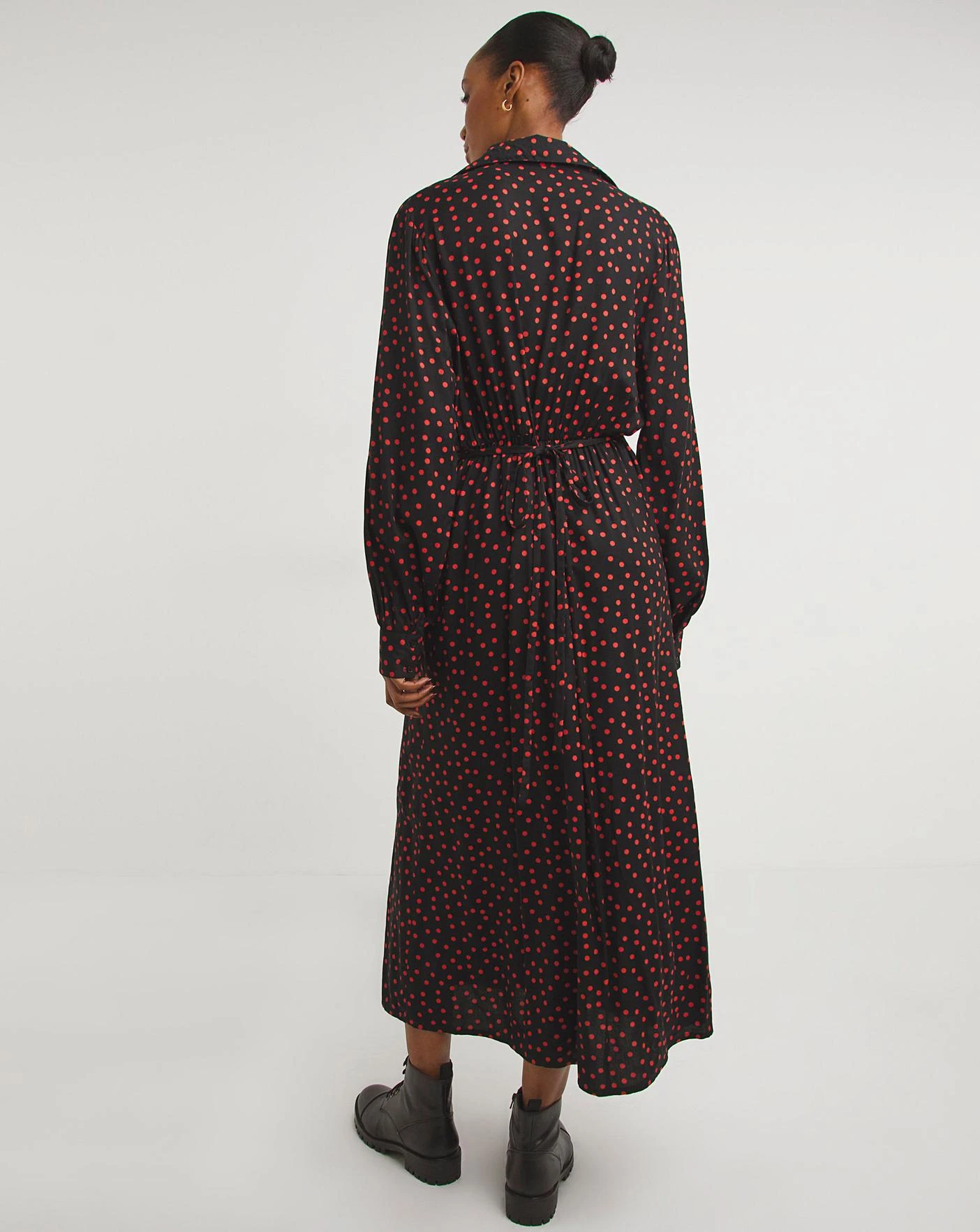 Update your wardrobe with this smart casual Viscose shirt dress. The sophisticated silhouette features a V-neck collar, long sleeves with buttoned cuffs and an elasticated back with a tie waist to maximise comfort. Adorned in a simplistic yet chic red spot print.