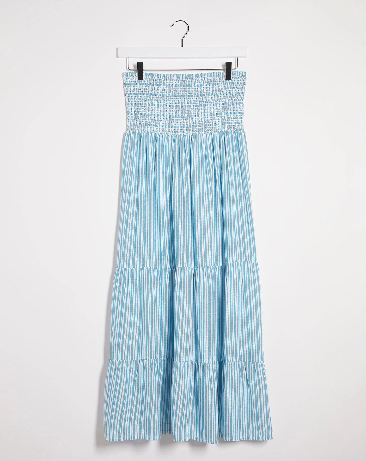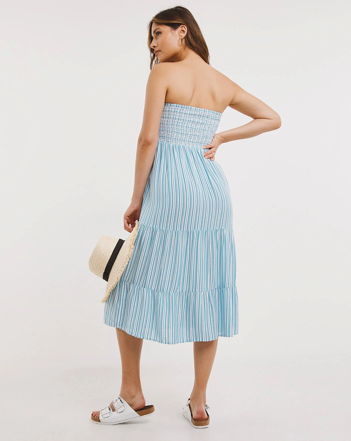 Another holiday outfit change? Make summer dressing easy with this bandeau dress. It features a shirred bodice and a floaty midi skirt that’ll slip on so easily. Style it with your sparkiest sandals for an alfresco dinner look. Length 112cm/44in.