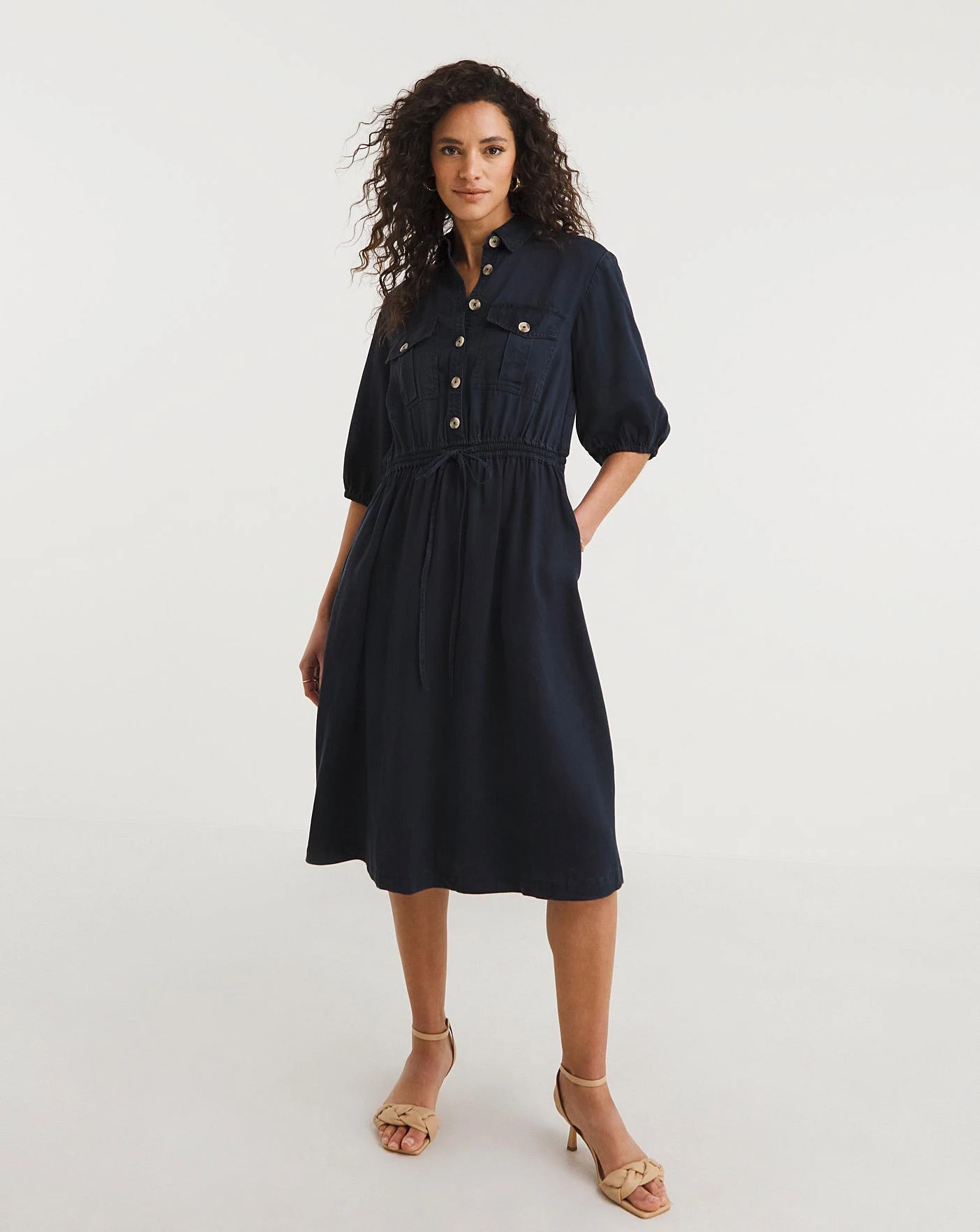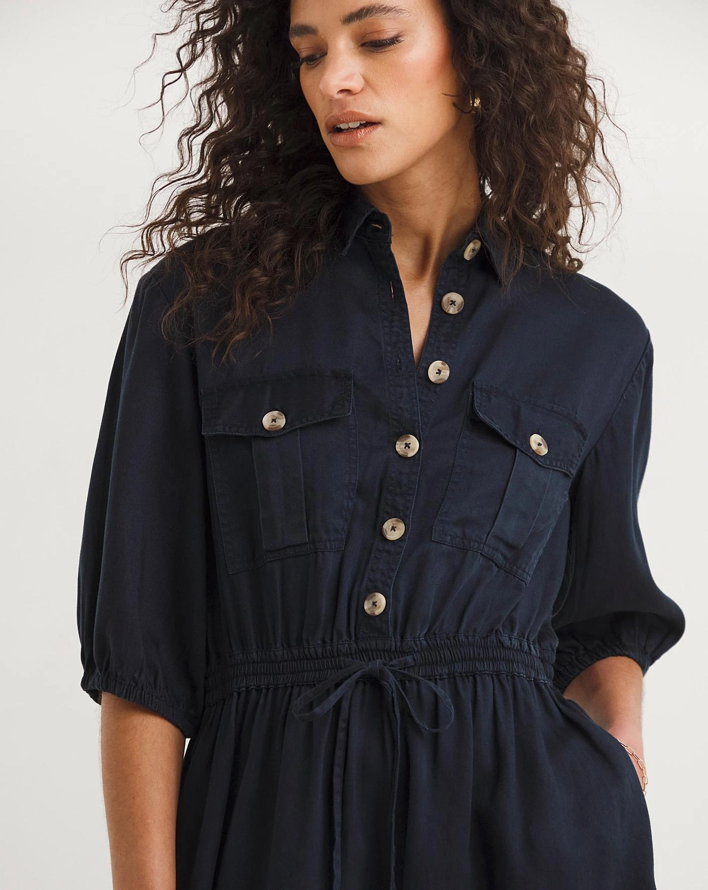 Our Elkie Twill Drawstring Dress is ready for summer days. From its collar and front contrasting button fastening to the mid length sleeves and 4 practical pockets this dress boasts uplifting utility style to be sought after this season. A drawstring waist makes for a flattering figure and feminine flair with its self-tie belt.