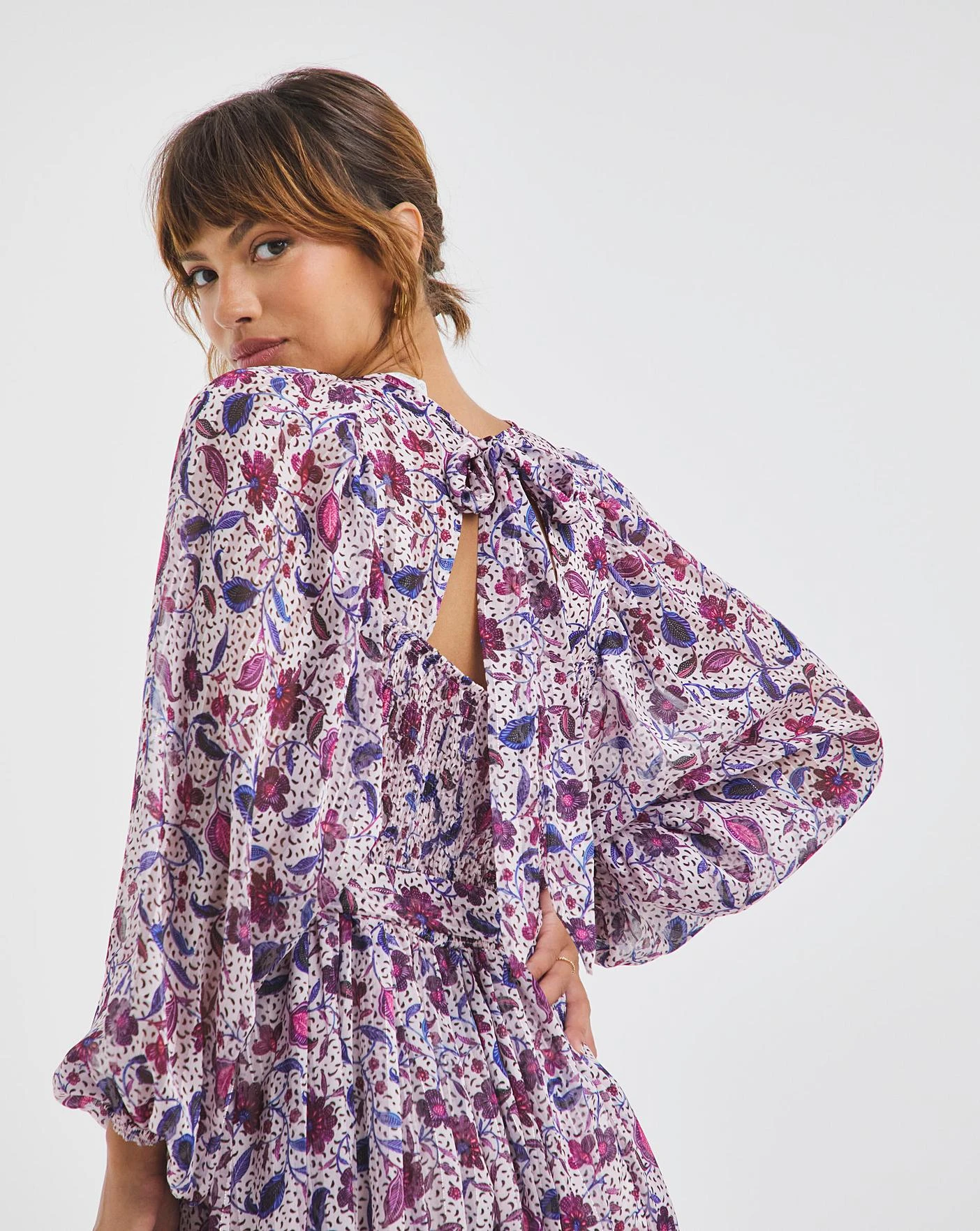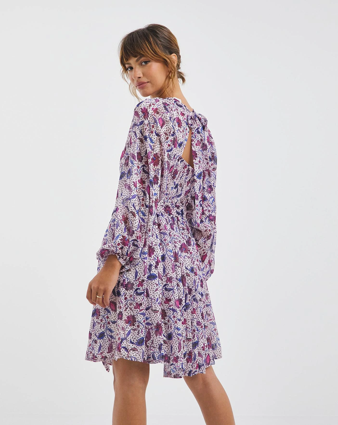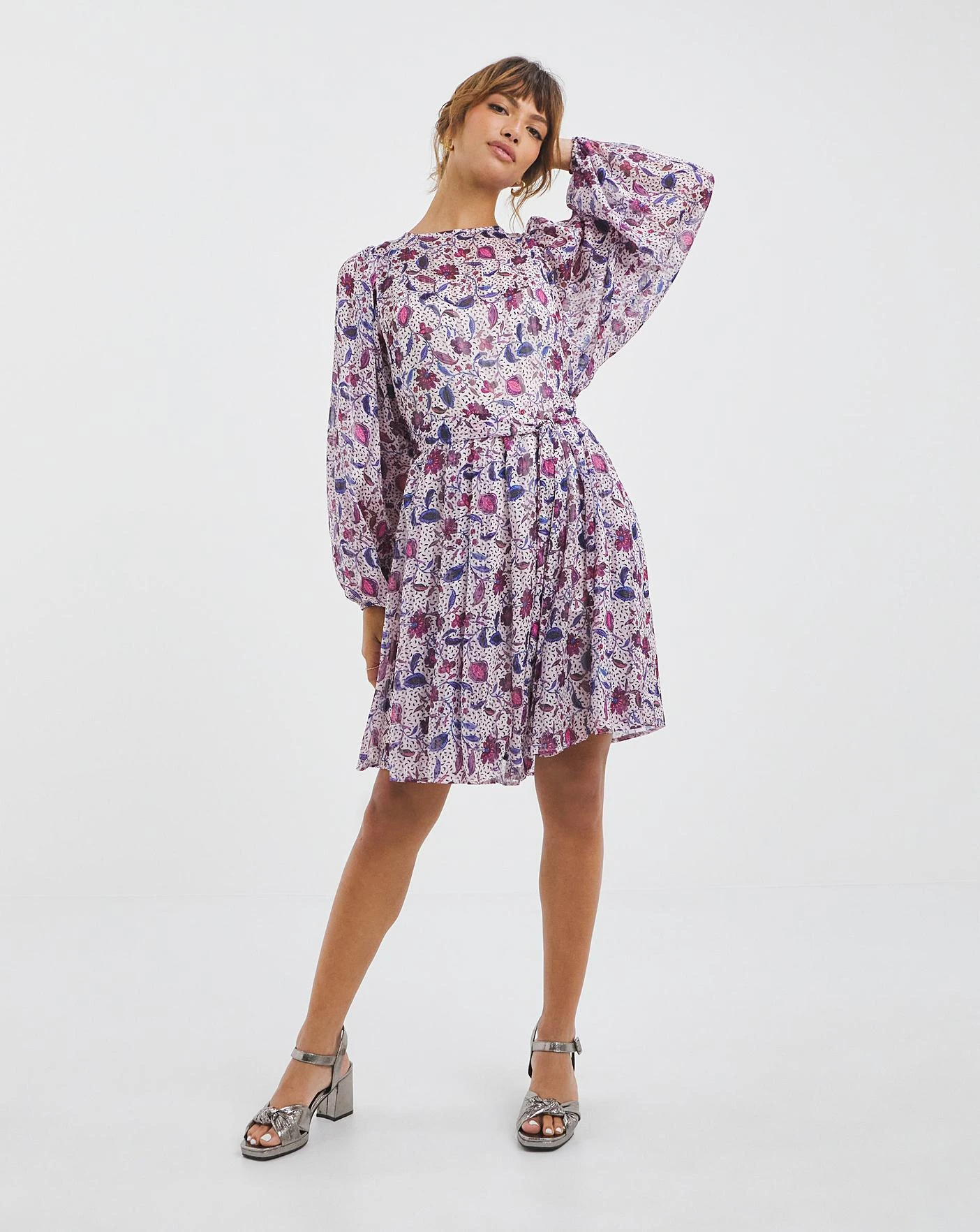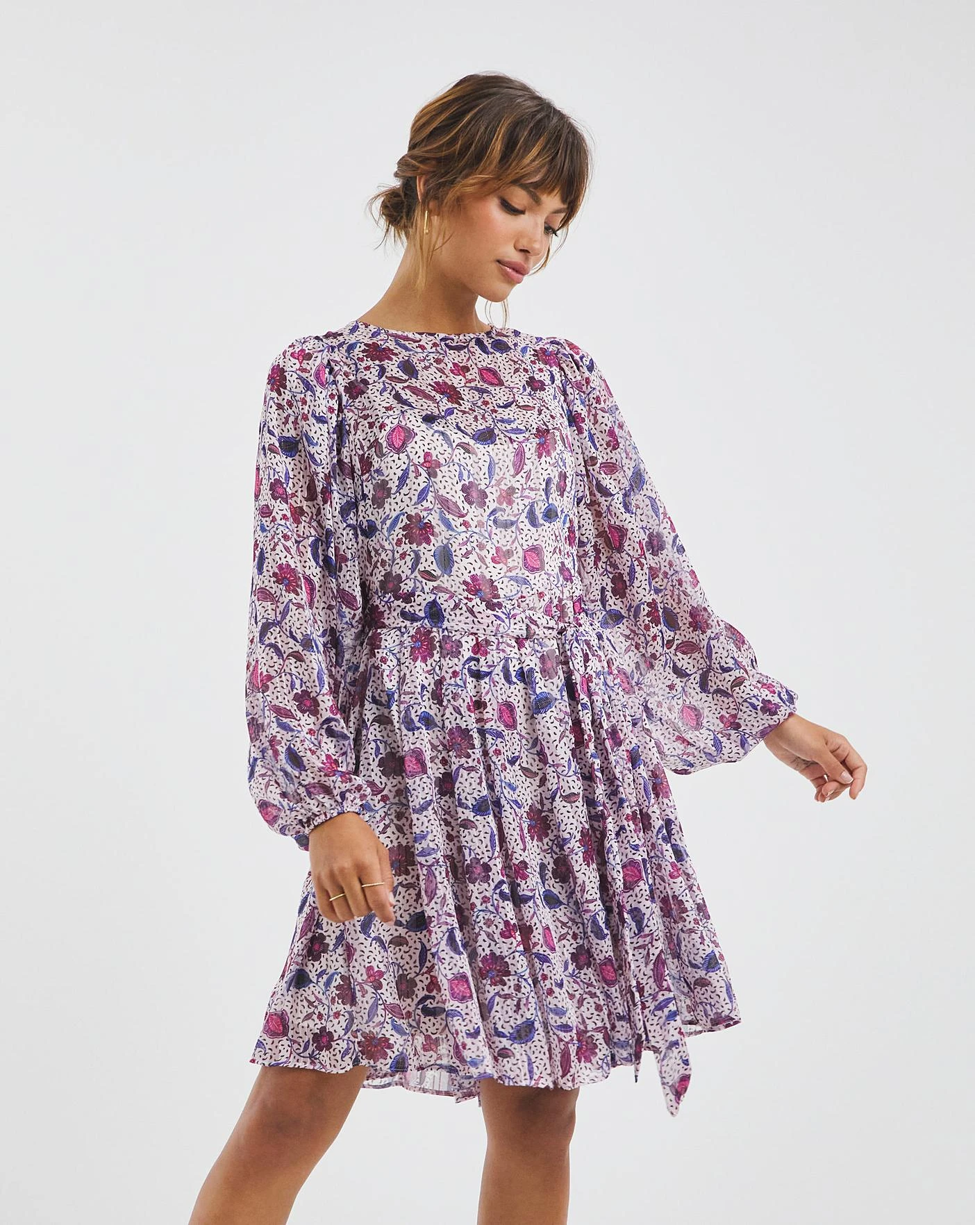 In a girly floral print, this tie waist dress is crafted from a flowing georgette material. Designed with a detachable tie waist belt, long sleeves with elasticated cuffs, and a shirred back panel. Complete with an open back with a tie neck feature. Includes a detachable cami lining.