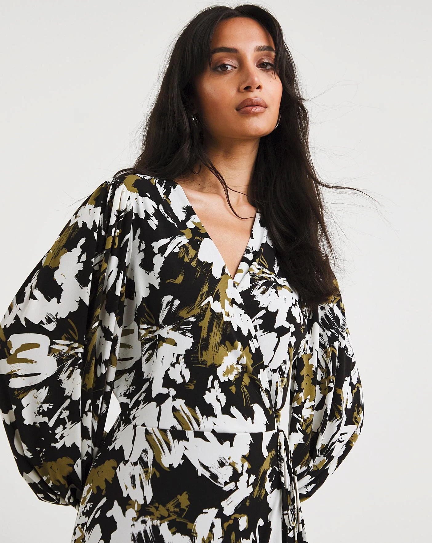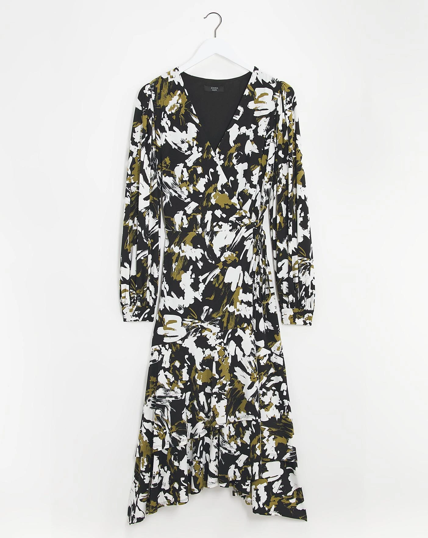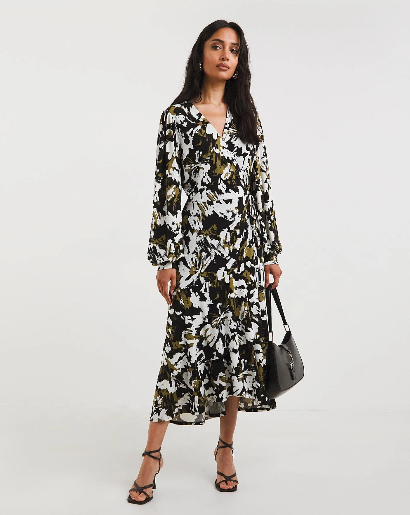 Crafted from a slinky jersey fabric, this dress ensures comfort throughout the night whilst maintaining an effortless look. Designed with balloon sleeves with elasticated cuffs, a feminine mock wrap front, and a chic frill wrap skirt. Style with your favourite heels and a matching clutch for a cool evening look.