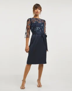 This stunning Joanna Hope dress features delicate 3D, floral embroidery on a breathable mesh fabric base. In a classic navy colour and slimming shape, it is completed with a contrast crepe skirt and a removable tie waist belt. This perfect occasion dress is finished with 3/4 mesh sleeves with pretty scalloped edging, and a concealed back zip opening.