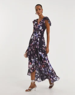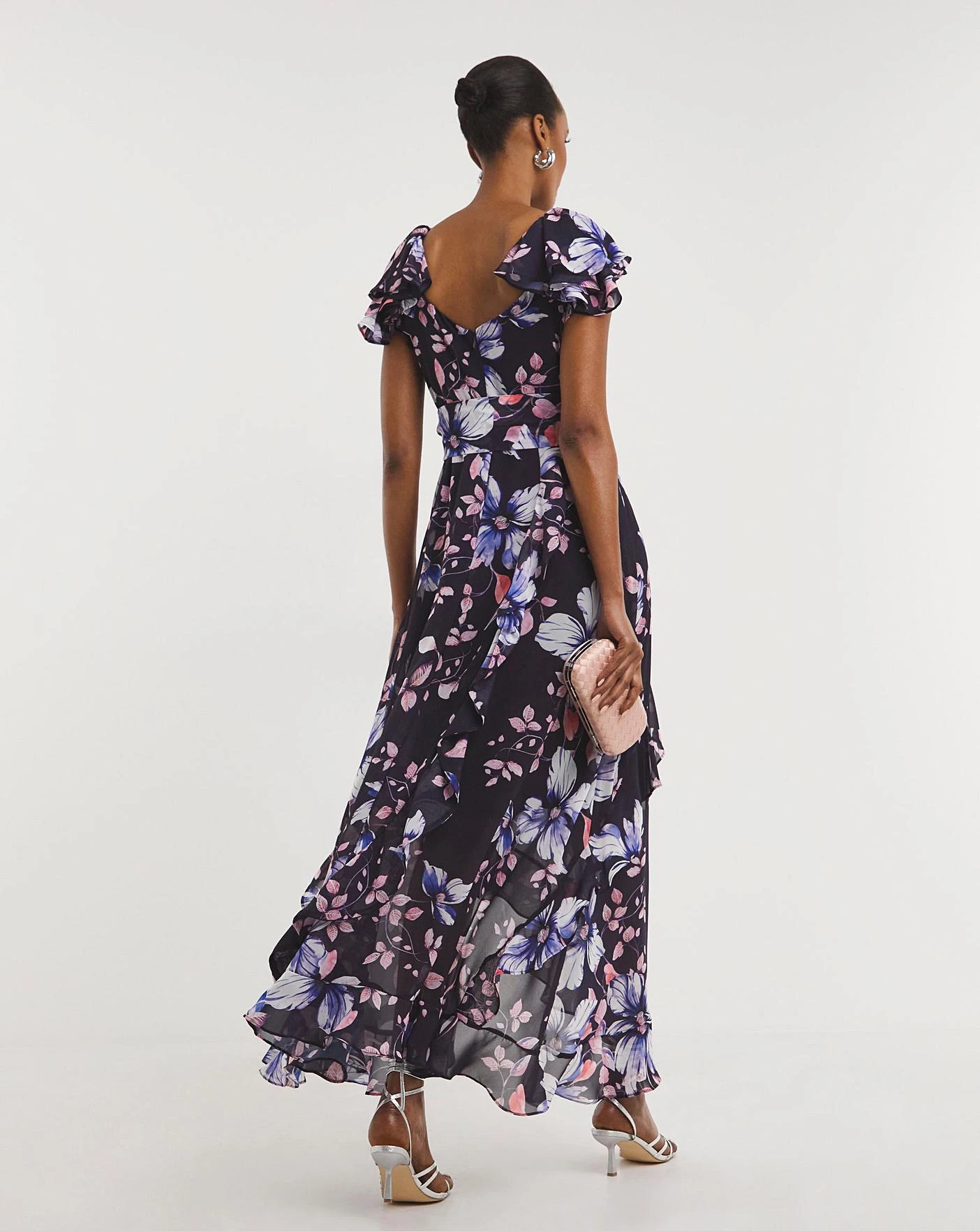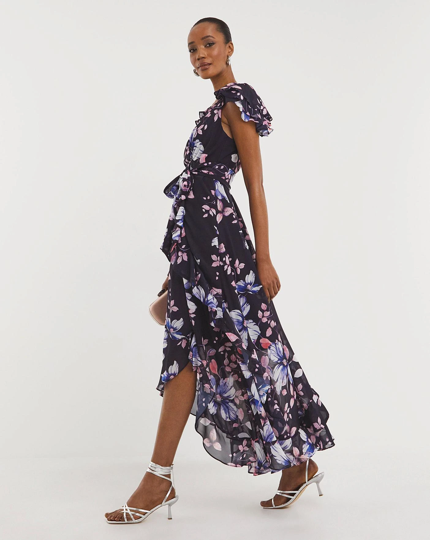 This Joanna Hope Ruffle Maxi dress comes in a flattering wrap style. It comes accented with features frill detailing on the shoulders and skirt, which is a high low hem and matching tie waist. Fastens with a concealed zip and comes lined in a stretch satin fabric.