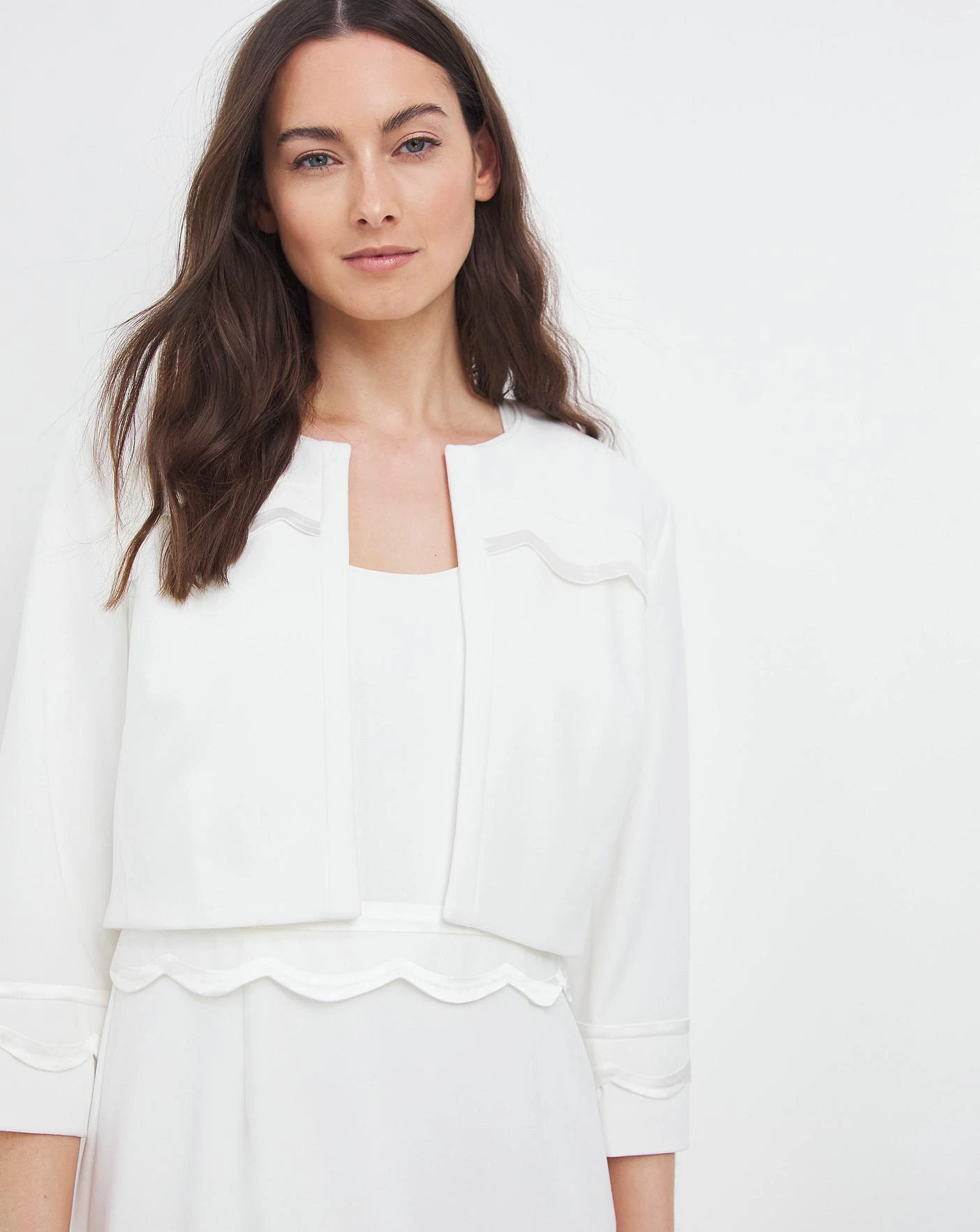 This lovely Joanna Hope dress and jacket set features a satin waist band and scallop detail. Dress comes lined and fastens with a center back concealed zip, hook and eye.
