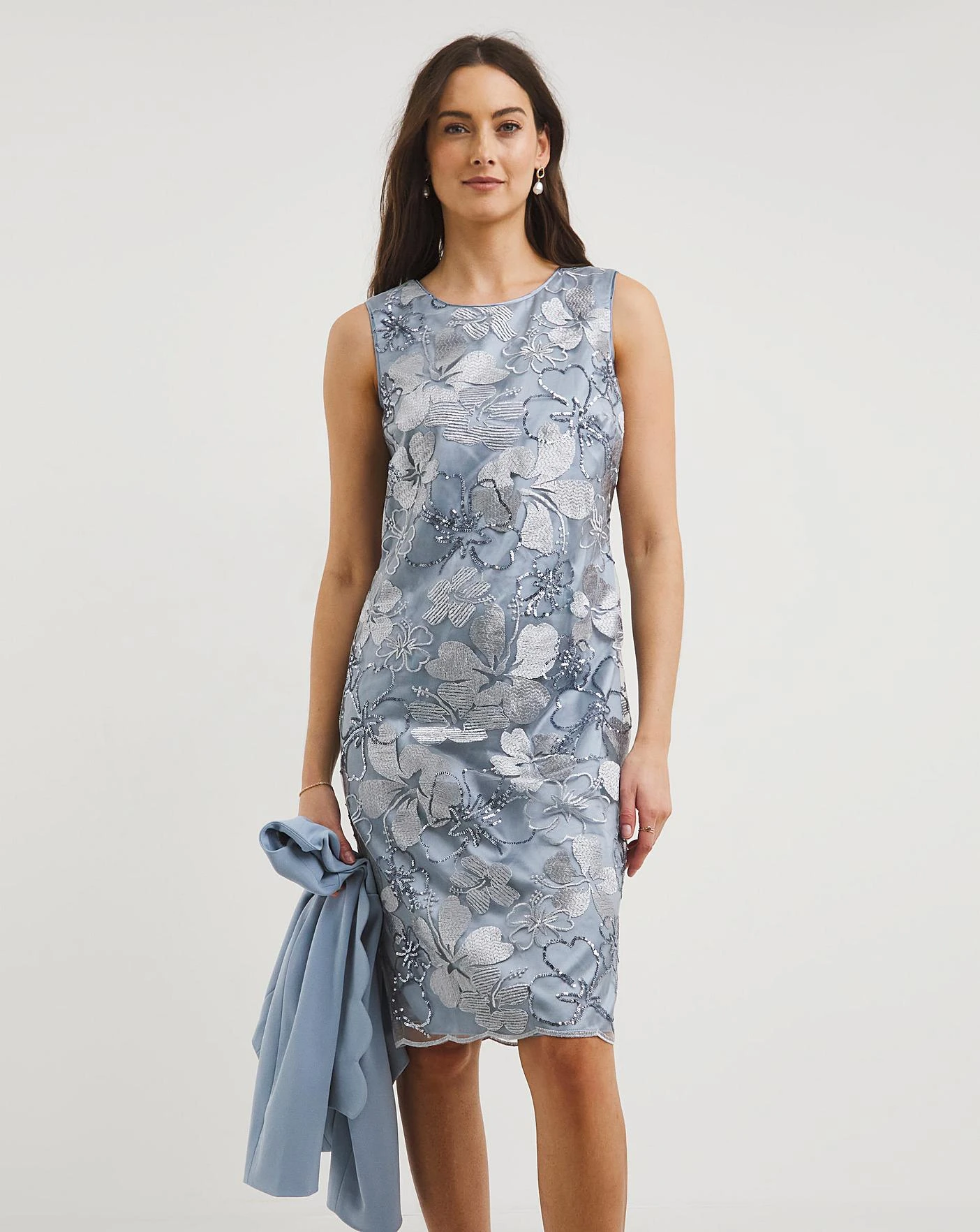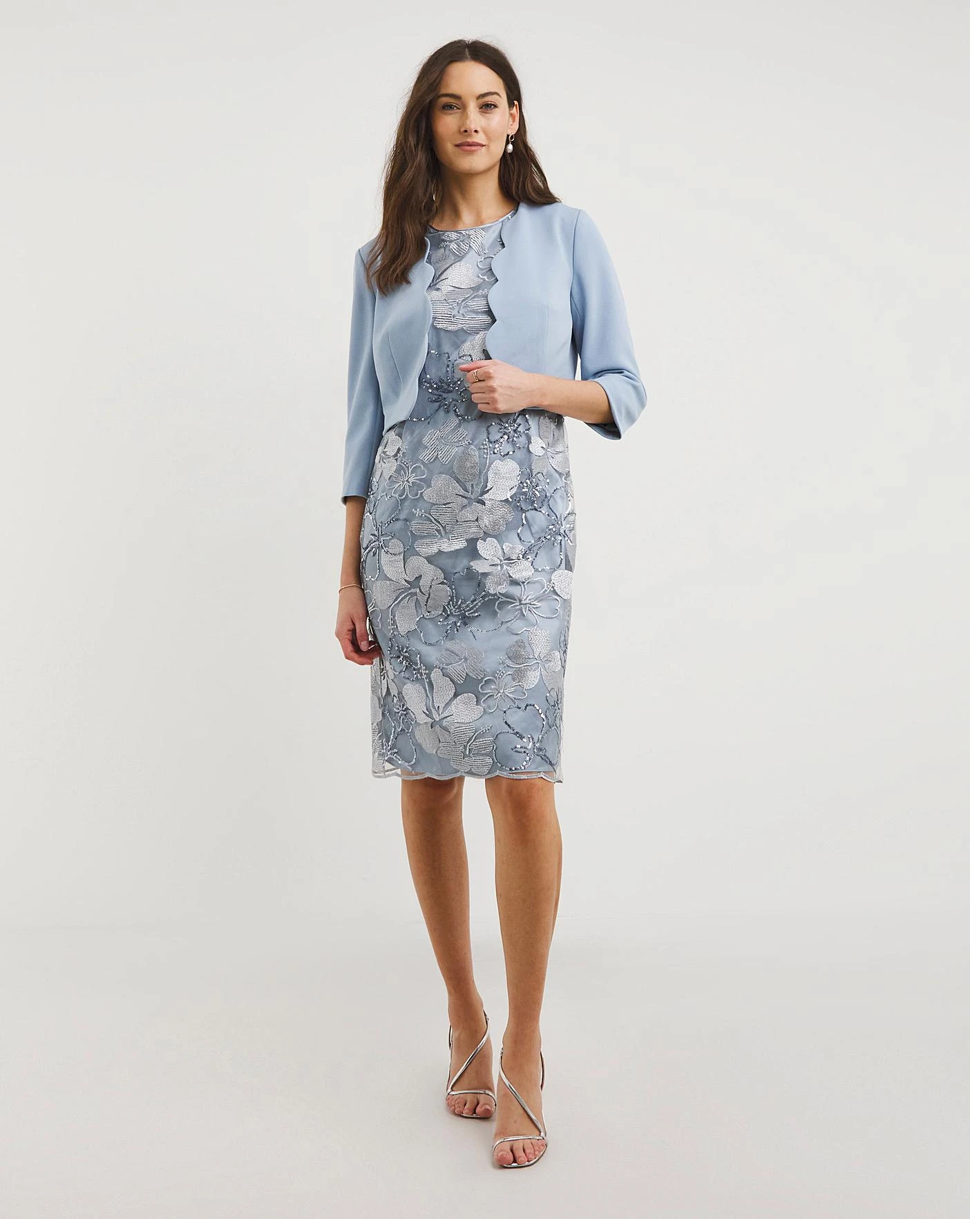 Perfect for mother of the bride, this elegant Joanna Hope dress and jacket set is crafted from intricate beading and sequin detailing. In a luxurious fabric, the matching cropped jacket features scallop detailing and 3/4 length sleeves, to give a clean-cut finish. In a slimming shift shape, this set feels effortless. Complete with a centre back concealed zip, hook and eye. Both the dress and jacket are lined.