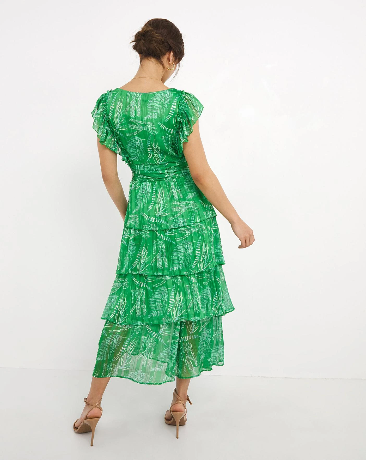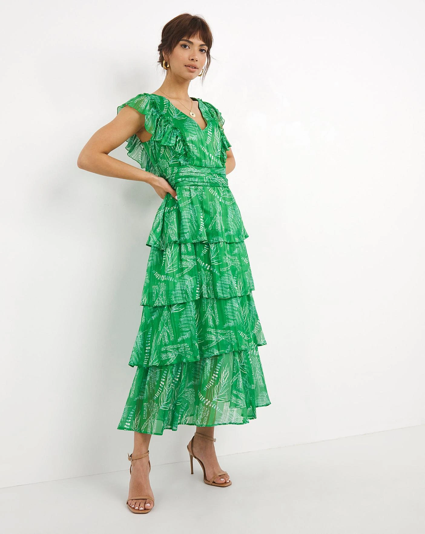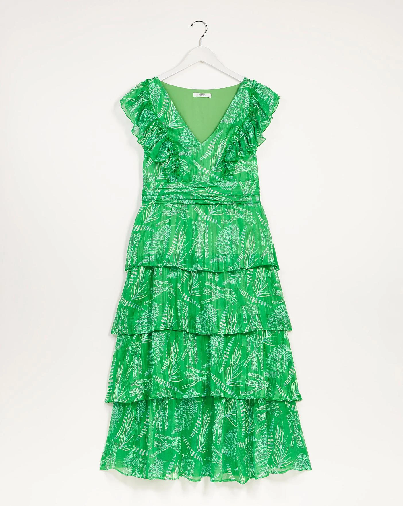 This lovely Joanna Hope printed dress features a flattering tiered skirt, shoulder ruffle and waist detail. Dress comes fully lined.