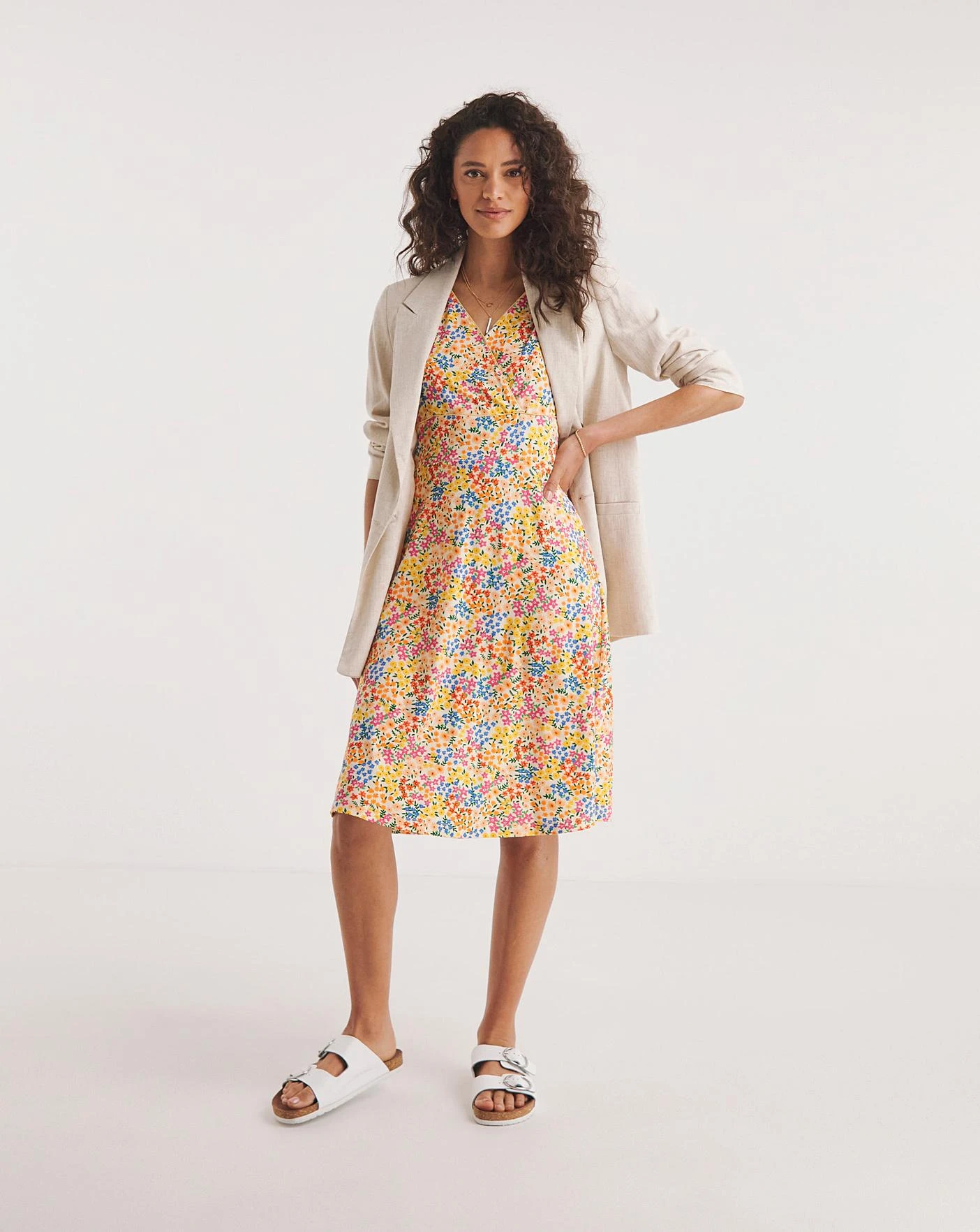 A real staple for summer, you’ll look incredibly charming in this jersey dress. We’ve taken a classic wrap style design and added a summer floral print that’s so delightful, it’s sure to add an feminine touch to your everyday style. Pair it with pumps and a denim jacket for a laid back look, or boots and a chunky cardi to make more of a statement.