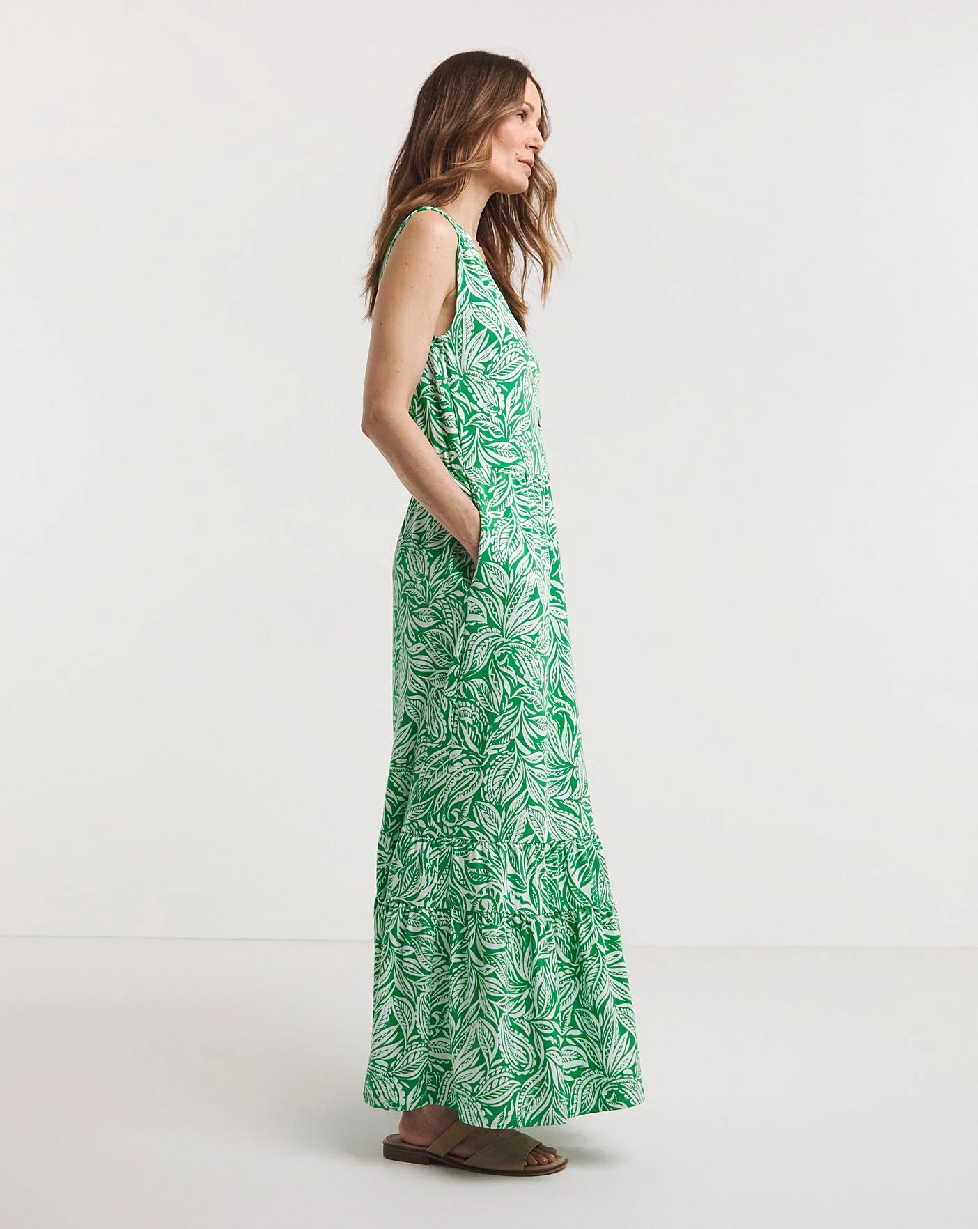 Add this button down printed jersey dress to your summer wardrobe. The jersey fabric gives this dress extra stretch making it your most comfortable throw on piece. Made from recycled polyester.