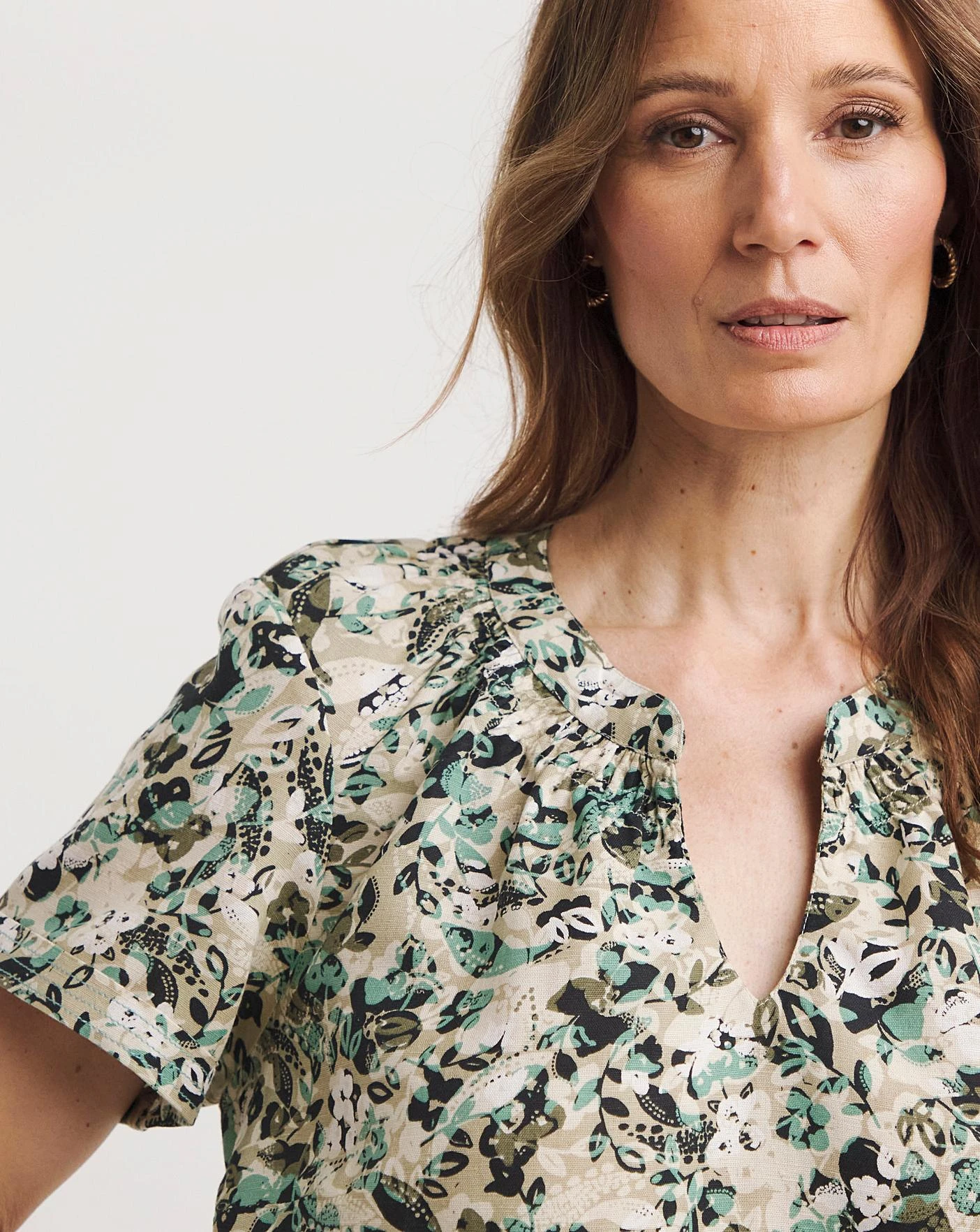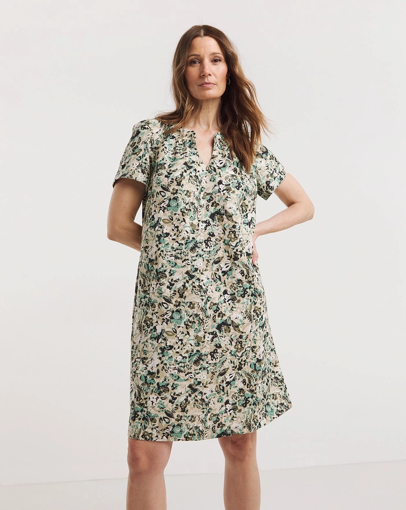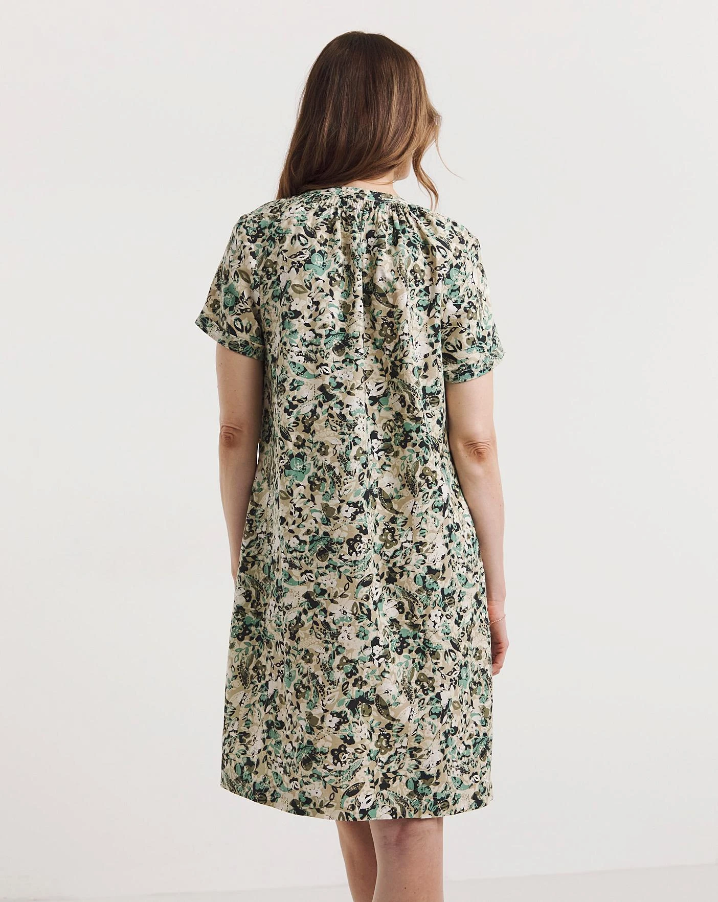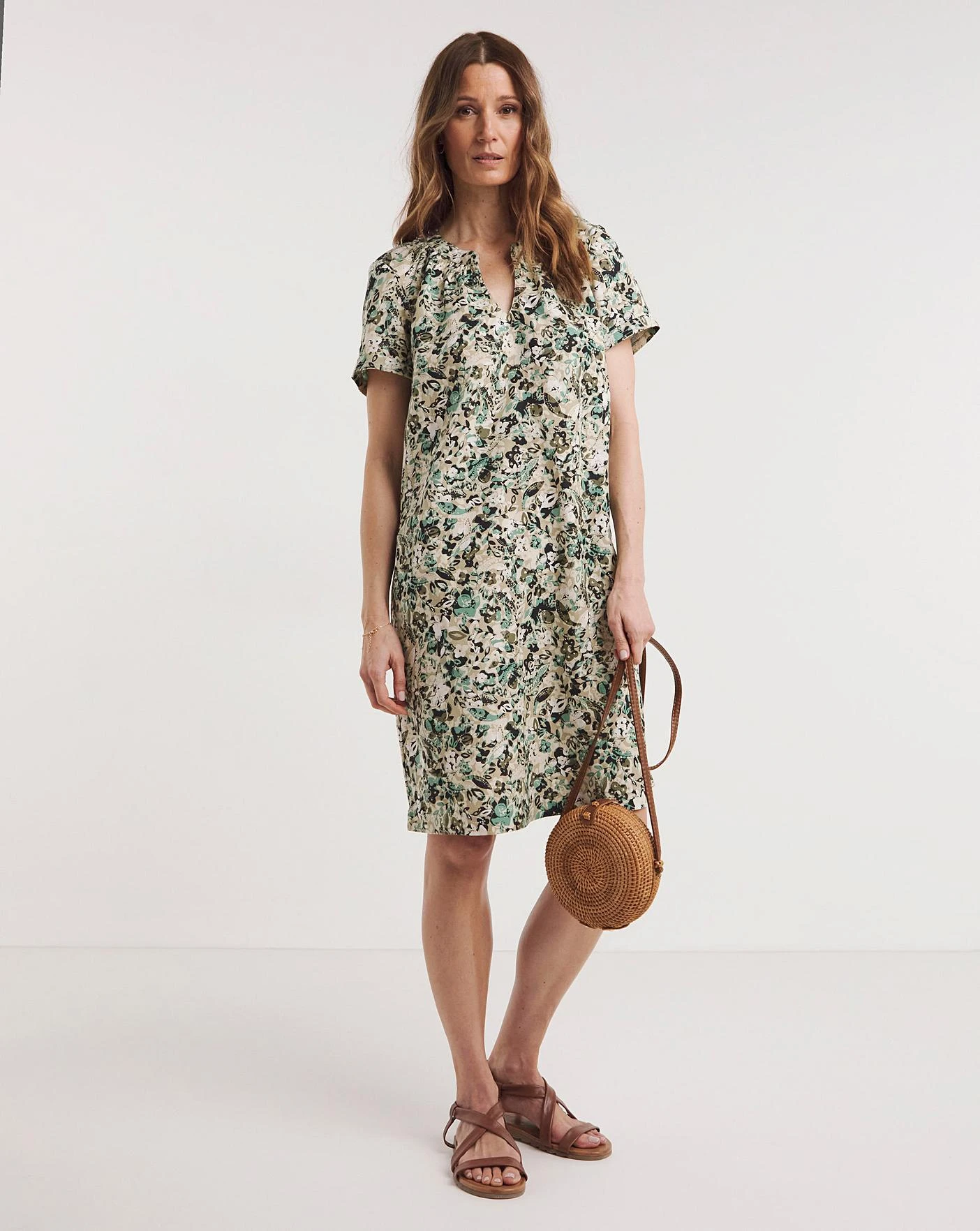 This linen shift dress is an everyday staple. Featuring shirring around the neckline short sleeves and a shift shape for a flattering fit. Made from a sustainable linen fabric.