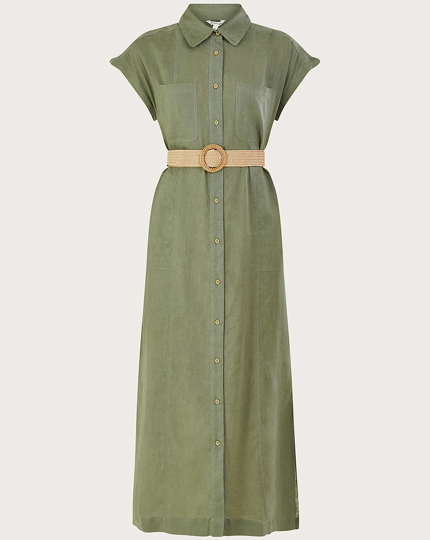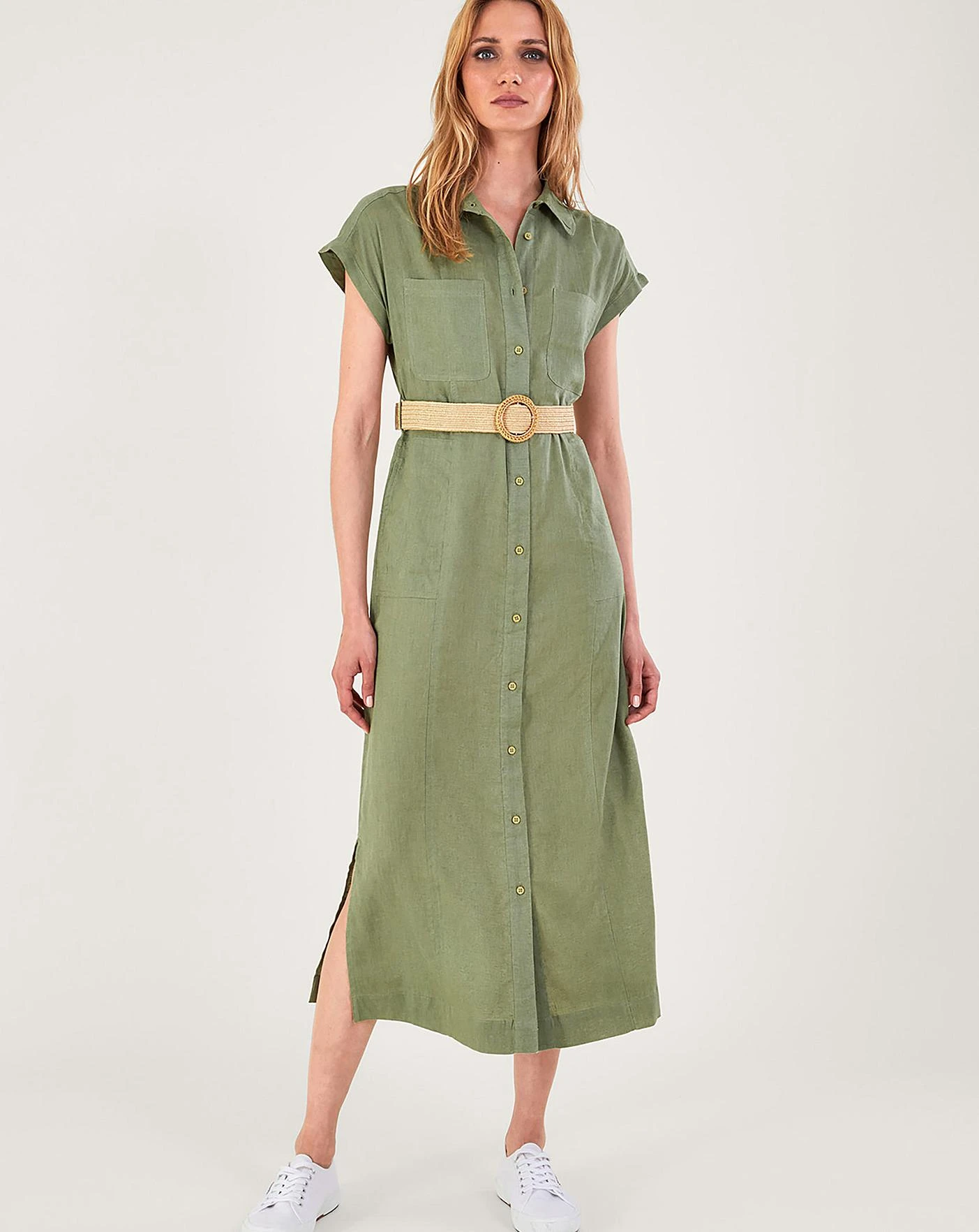 - Effortlessly cool, this button-through dress leaves us longing for sunnier days. We give it a high rating on comfortability thanks to its loose profile, side slits and short sleeves – with the option to cinch in the waist with the adjustable and removable woven belt. Spun in a light linen blend, the khaki hue loves to live in spring and summer edits.