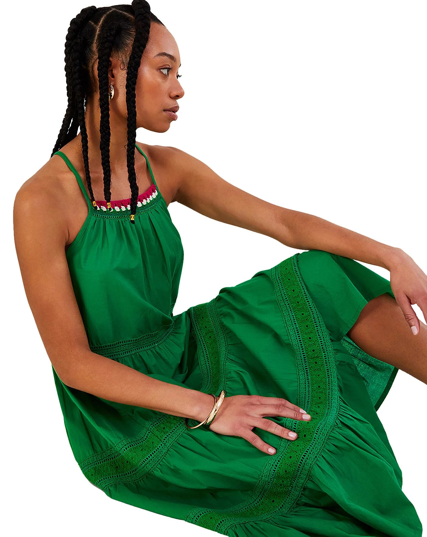 - Cast in a vibrant grassy green, this dress is spun in soft cotton that’ll keep you cool from beach days, to morning coffees in the garden. The square neckline boasts contrast embroidery, cinching in at the waist and tiering through the skirt with broderie detailing for a bohemian finish. Simply pair this piece with your comfiest cork bed sandals for an easy breezy summer finish. As part of the journey to make our clothes kinder to the world around us, this item was made using more sustainable raw materials, such as organic cotton, recycled polyester and viscose from responsibly grown forests.
