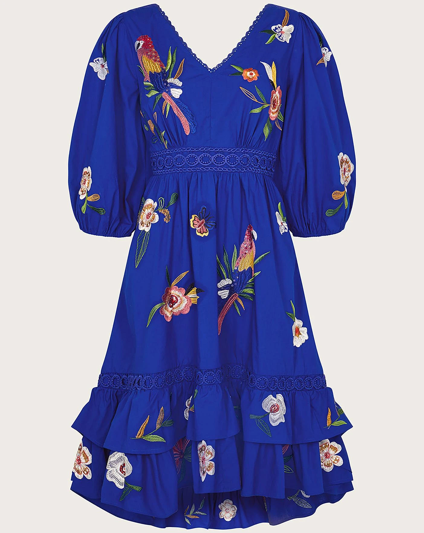 - Be bold with Ellie, cast in a vibrant cobalt blue that’s sure to turn heads at the garden party. She features feminine frills to the hem, with delicate embroidery to the waist. The all-over embroidery boasts a collection of birds, butterflies, and florals, whilst the bodice boasts a shirred panel on the reverse, ensuring a comfortable fit. As part of the journey to make our clothes kinder to the world around us, this item was made using more sustainable raw materials, such as organic cotton, recycled polyester and viscose from responsibly grown forests.