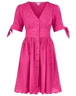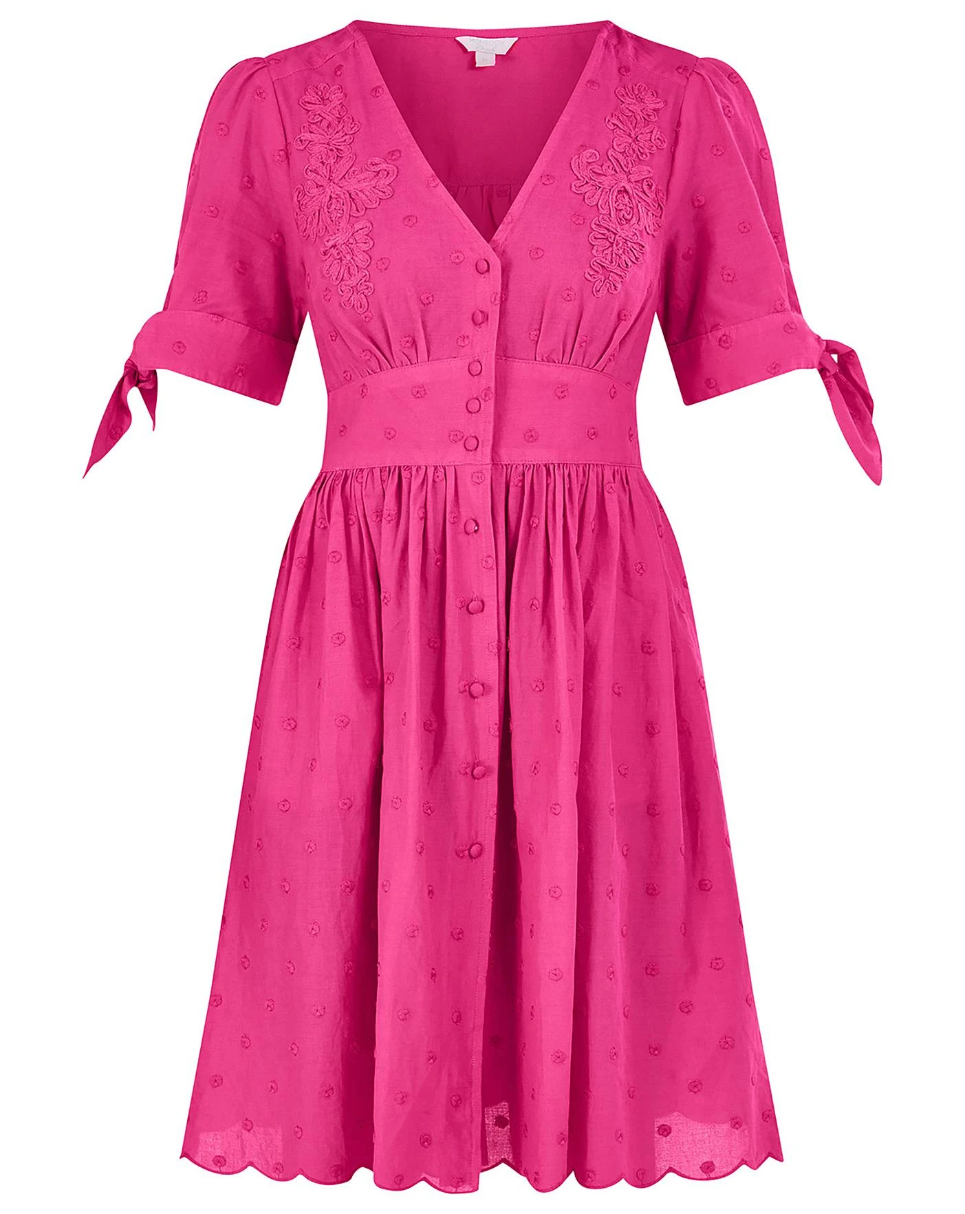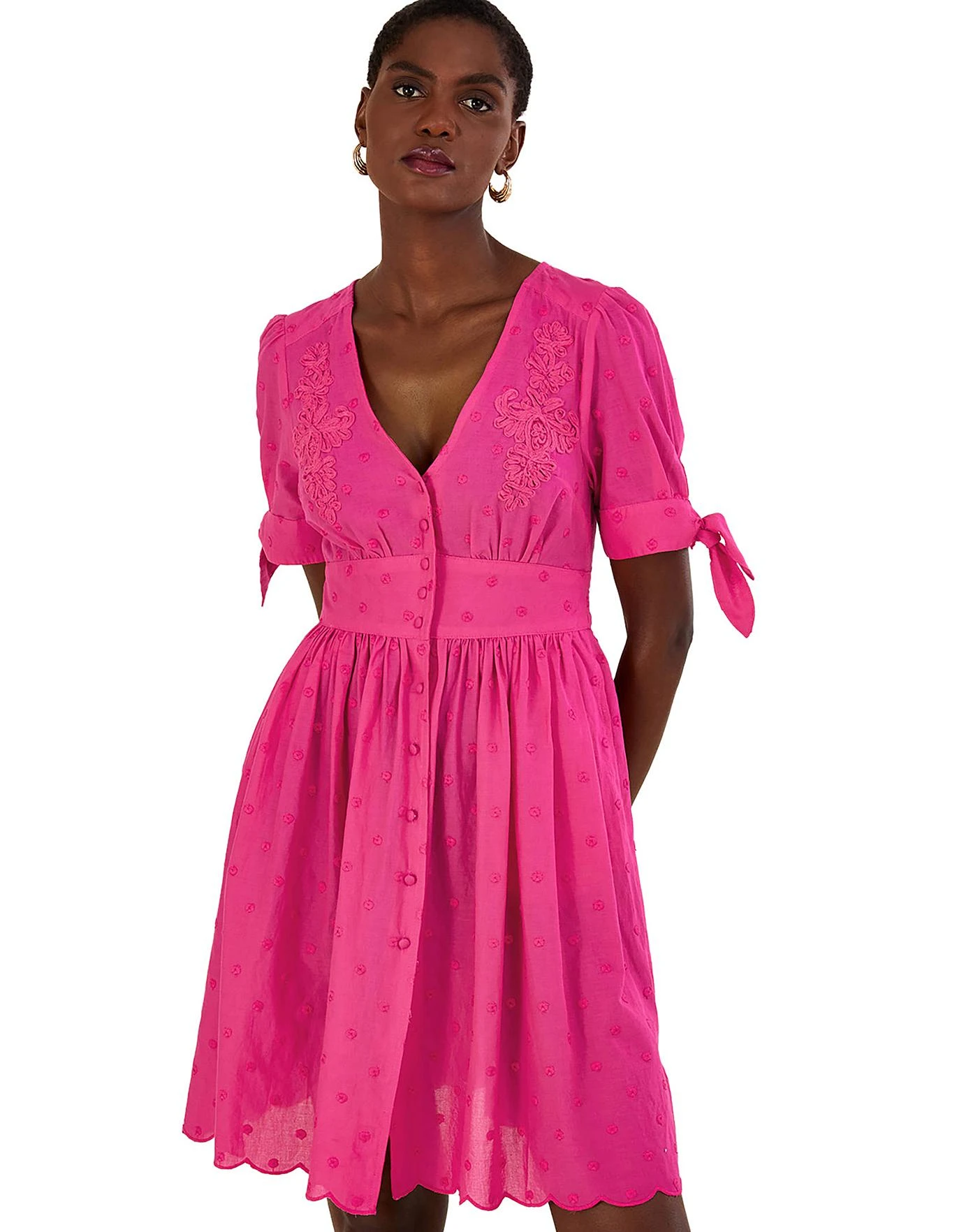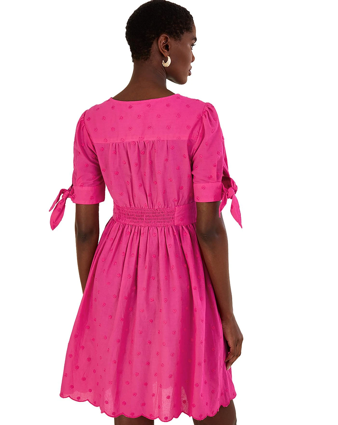 - In airy dobby cotton, this floral embroidered dress has a sweet feel to it, with the bunny tie sleeves and fit-and-flare silhouette. Style her with a pair of boots and layer a jumper over on chilly days. Just one of our steps towards a future for sustainable fashion, we introduce S.E.W: our commitment to using more eco-conscious materials in our ranges. This capsule collection is created using fabrics that are both kinder to the planet and have a reduced environmental impact. You’ll see blends of organic and better-sourced cotton, viscose from more responsibly grown forests and recycled polyesters made from post-consumer waste.