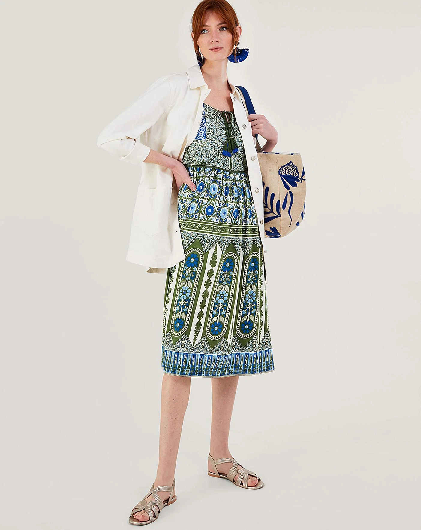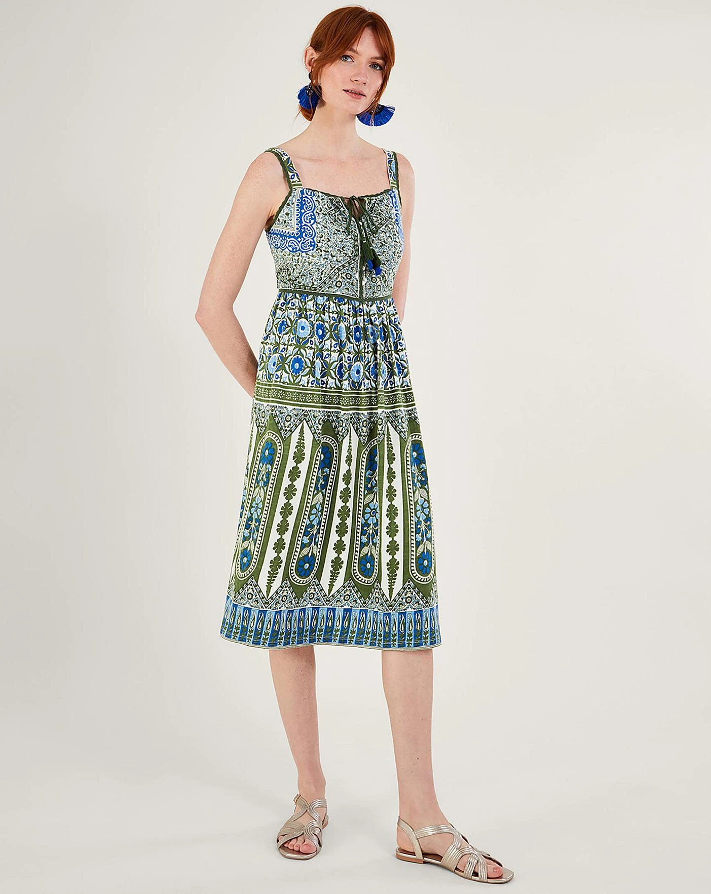 - An earthy palette flushes through the heritage print on this dress, falling to knee length for an airy fit. Featuring slim straps and a tie neckline to the top of the dress, it’s finished with lace trims for a feminine touch. Designed in better-sourced cotton, accessorise with a gold pendant necklace and wrist bangle to add a warm touch. As part of the journey to make our clothes kinder to the world around us, this item was made using more sustainable raw materials, such as organic cotton, recycled polyester and viscose from responsibly grown forests.
