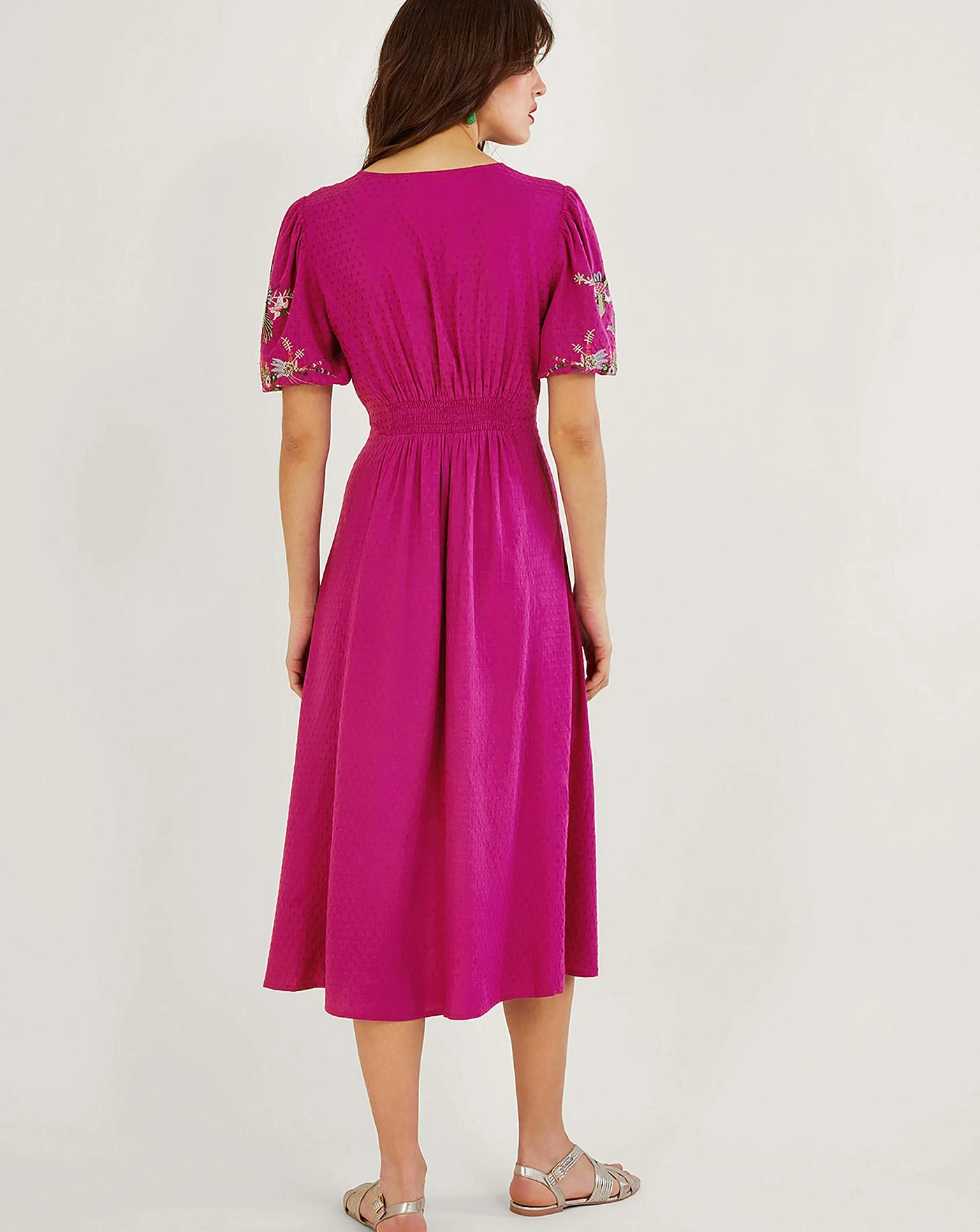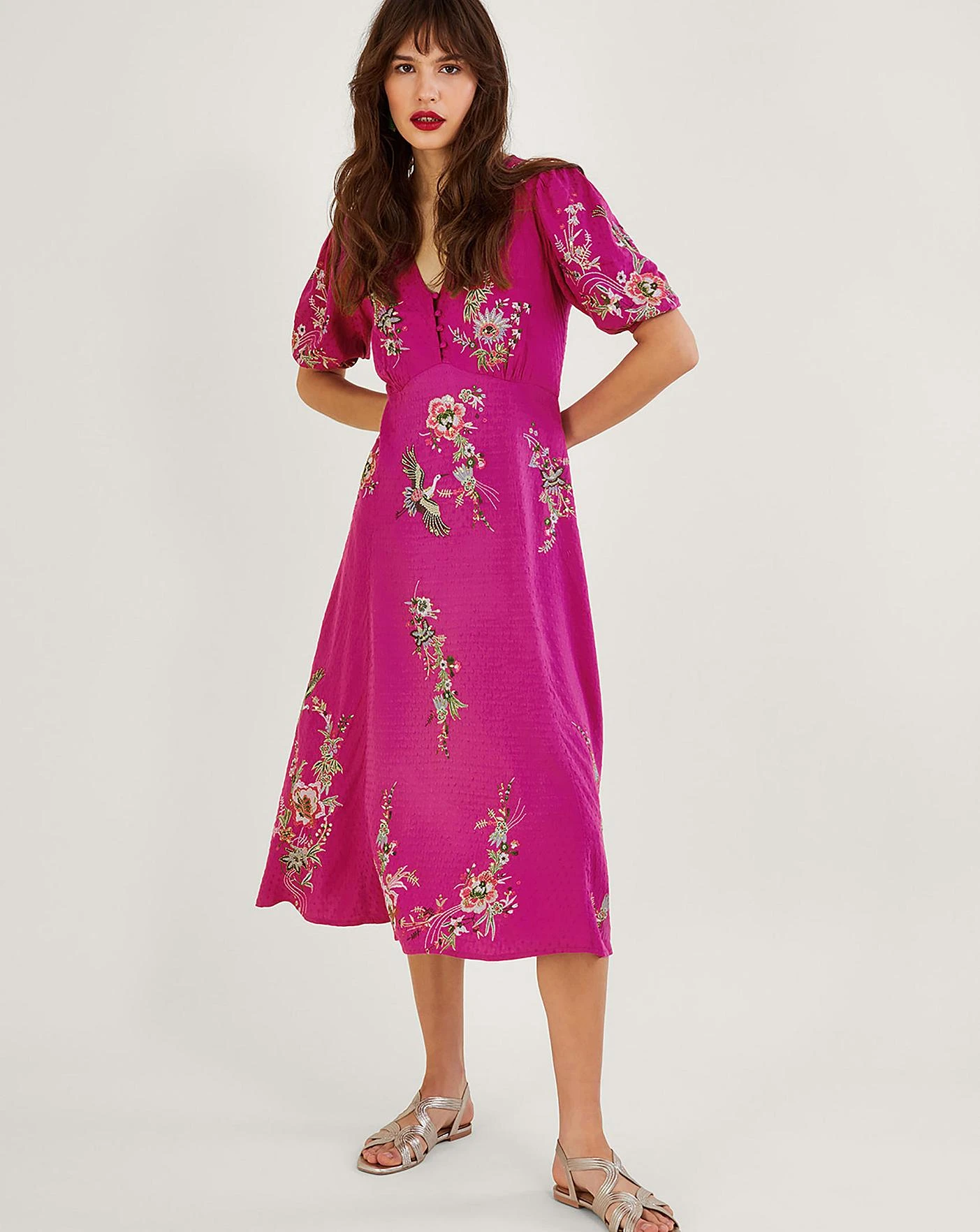 - Dressed in florals and sprinkled with sequins, our Jenny dress is ideal for afternoons enjoying tea and scones (and maybe some fizz). The dobby fabrication is light and airy, moving freely through the skirt whilst the waist sits close to the body thanks to the elasticated panel on the back. Finished with puff sleeves and button detailing through the bust, style it with block heels for comfort. As part of the journey to make our clothes kinder to the world around us, this item was made using more sustainable raw materials, such as organic cotton, recycled polyester and viscose from responsibly grown forests.