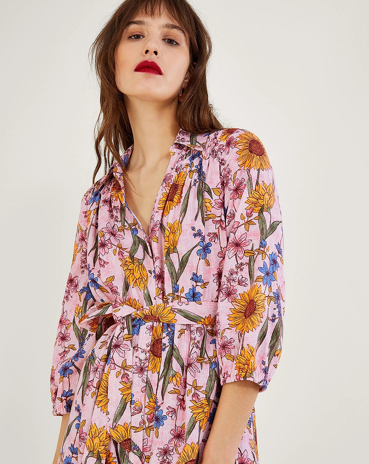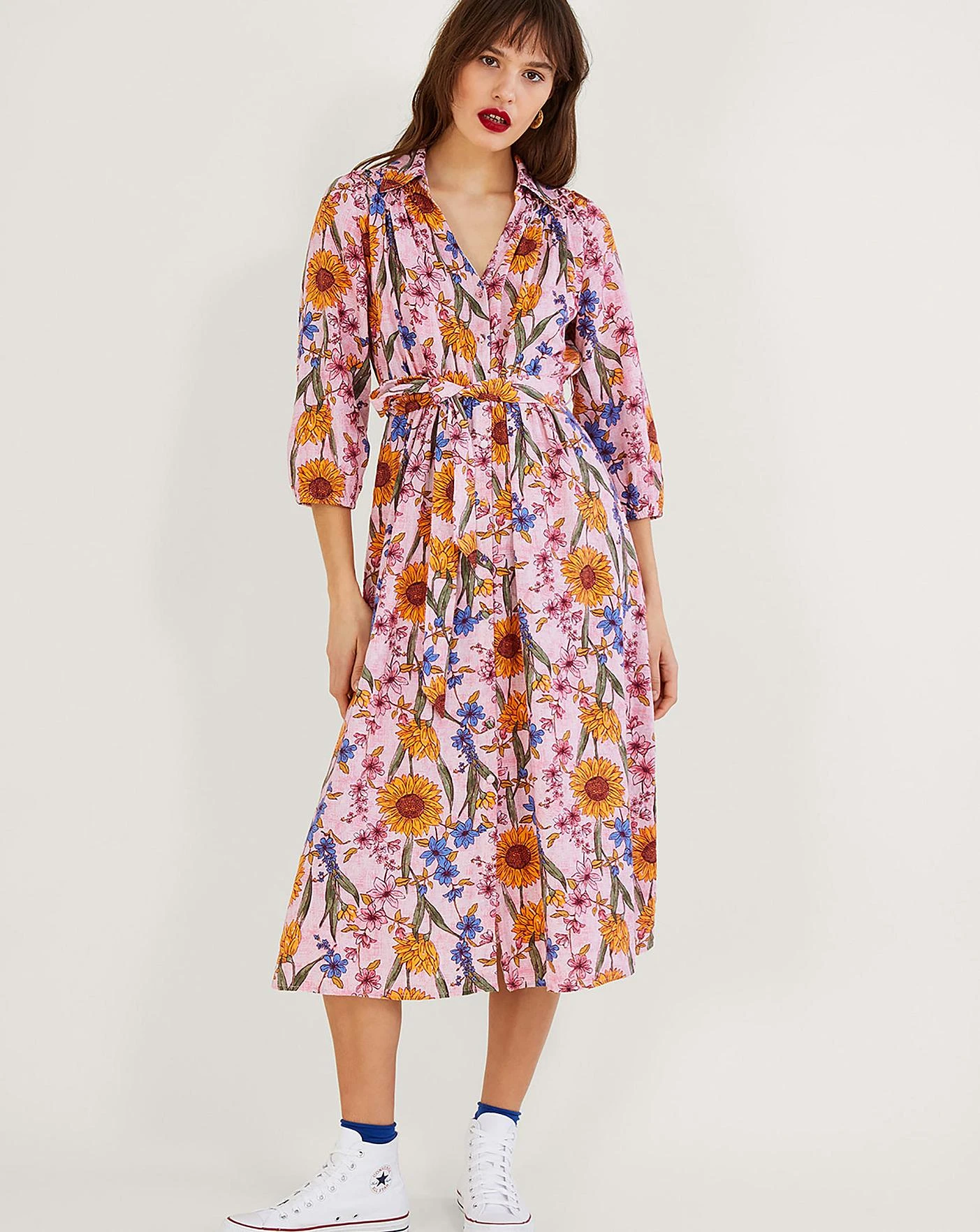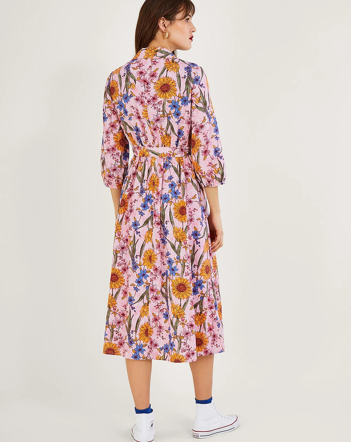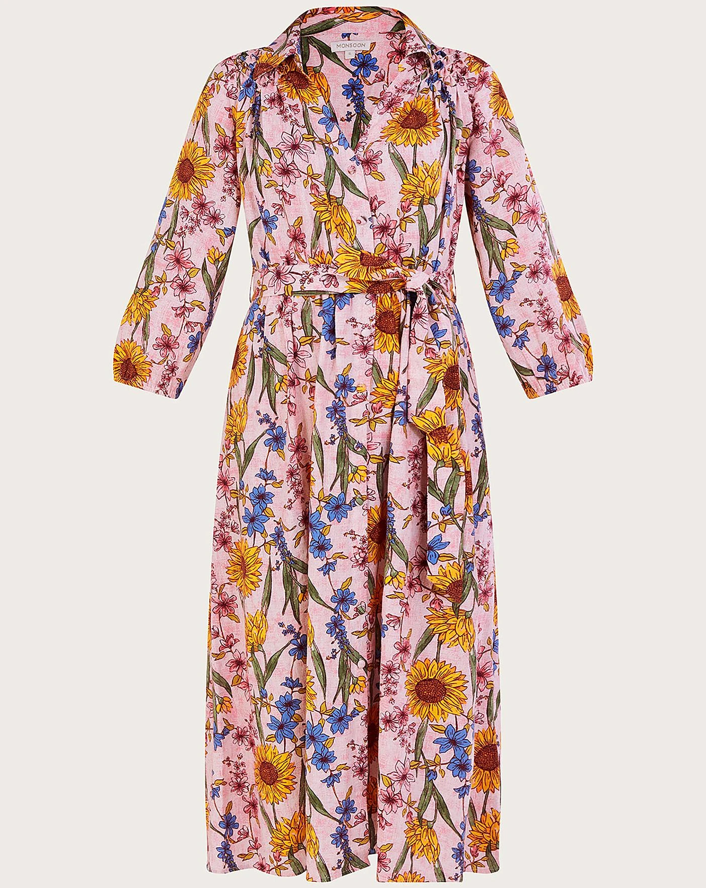 - Sunflowers for summertime…check!Decorated in rustic-style illustrated florals, Leilah will see you through trips to the high street and garden parties. The matching belt helps to add shape, looking best when tied in a bow to the side. As part of the journey to make our clothes kinder to the world around us, this item was made using more sustainable raw materials, such as organic cotton, recycled polyester and viscose from responsibly grown forests.