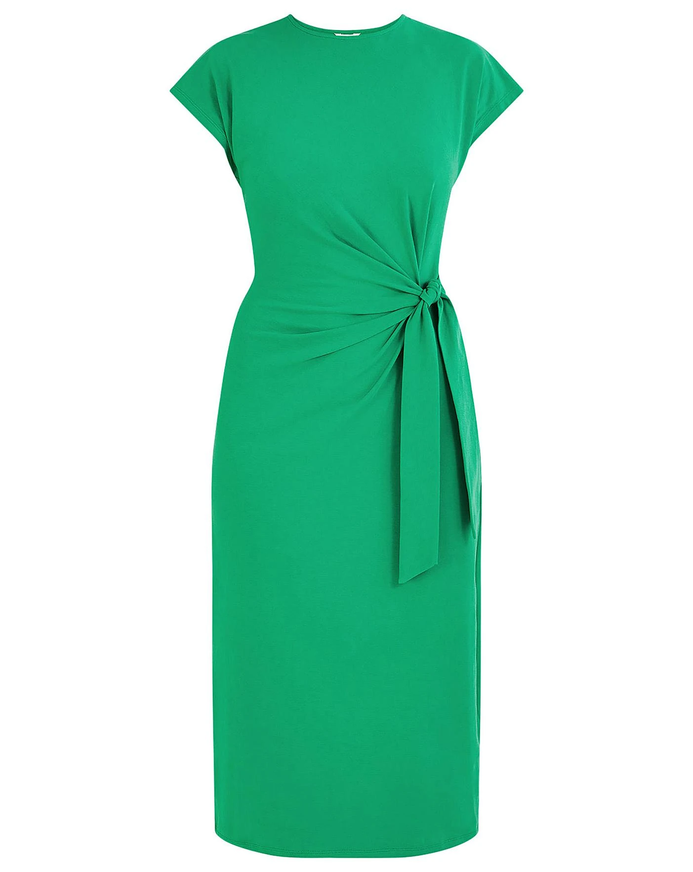 - Elevated jersey.For the office, dinner dates and back-to-back meetings, opt for comfort when choosing this dress. Designed in green jersey, it features short sleeves that flush over the shoulders and a longline silhouette that hugs the body, sitting defined around the waist with a side tie and falling to a midi-length skirt. As part of the journey to make our clothes kinder to the world around us, this item was made using more sustainable raw materials, such as organic cotton, recycled polyester and viscose from responsibly grown forests.