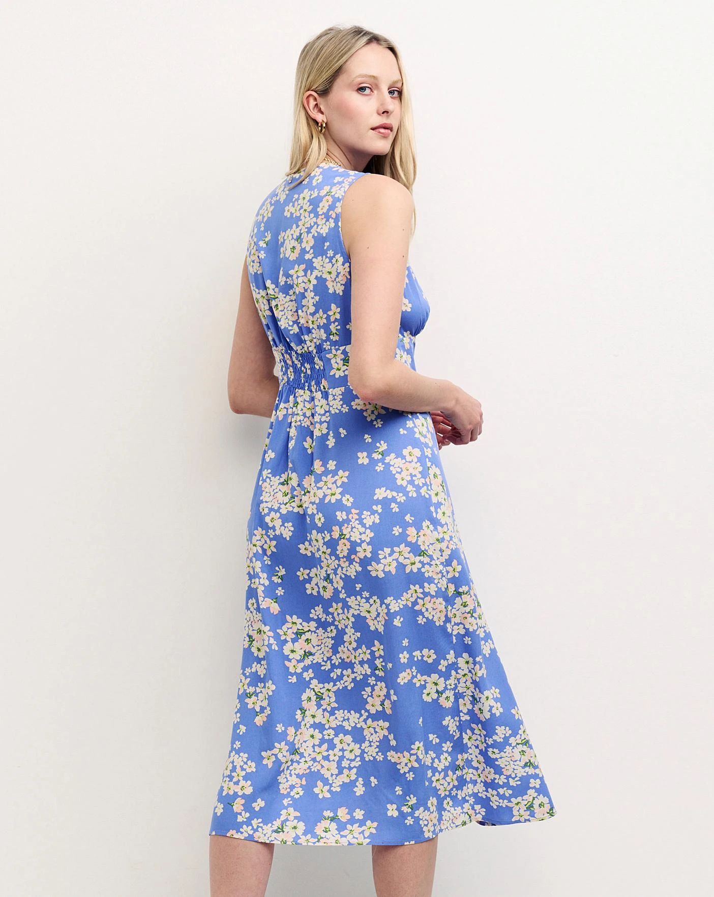 Make a statement in our Sandra midi dress. Featuring a sleeveless frame that’s fitted at the waist, she’s made from responsible viscose with buttons running down the front. The blue daisy print has us longing for summer- all you need is a pair of hightops to complete the look.