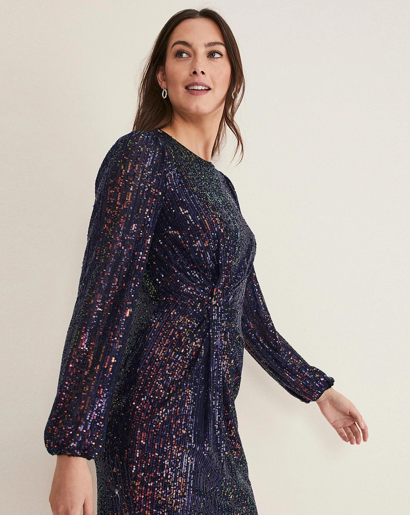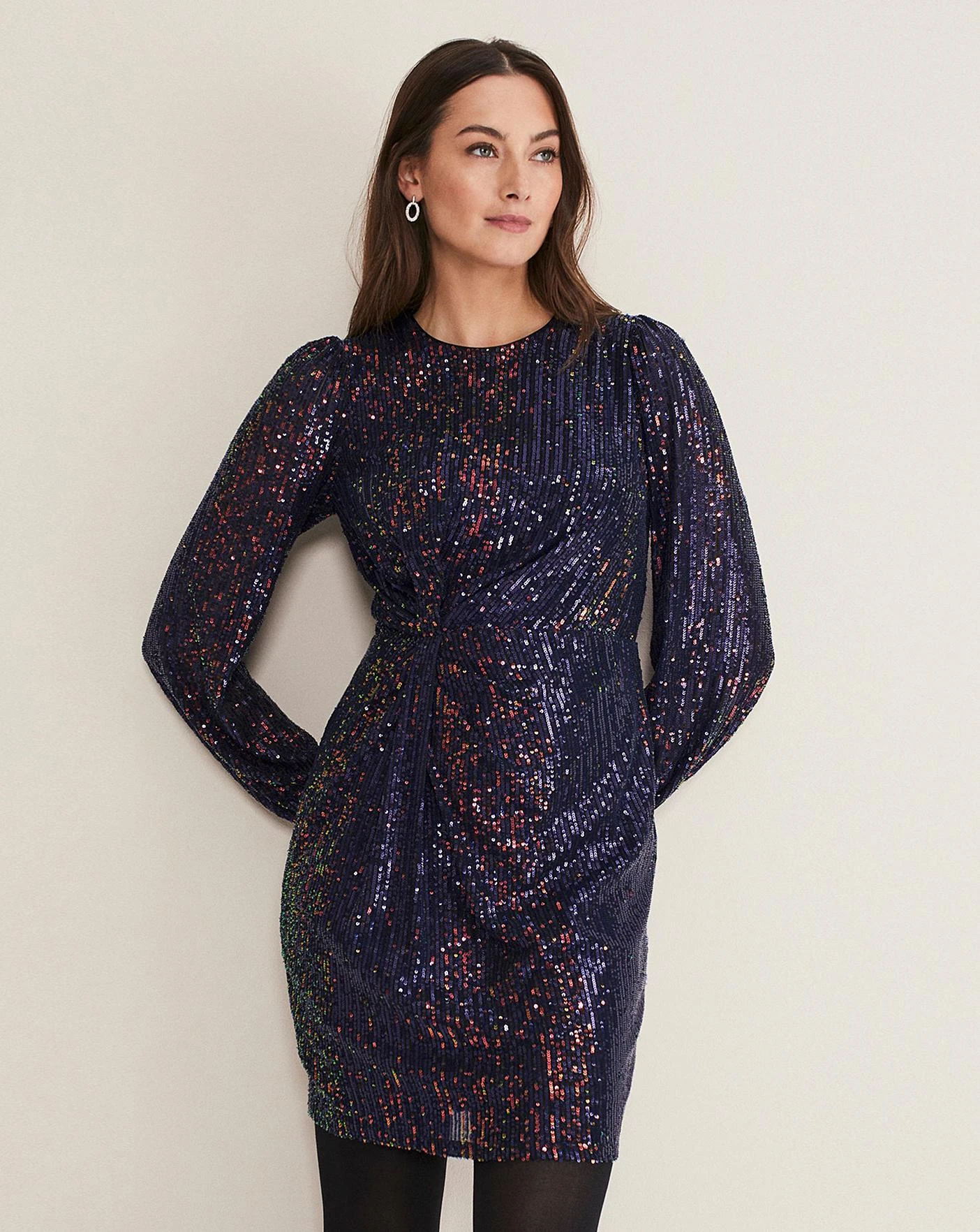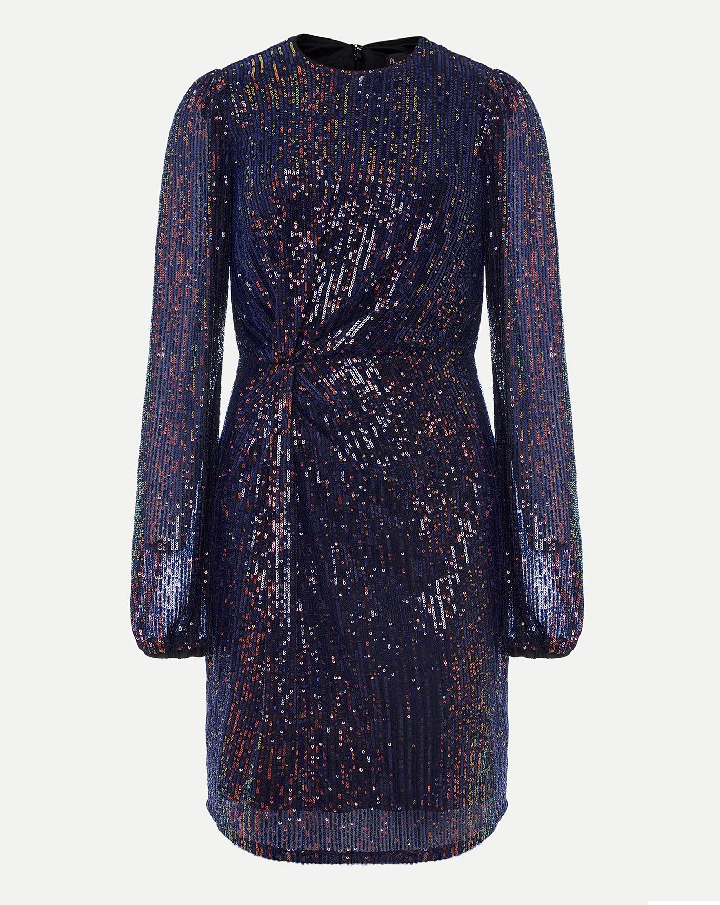 Meet this season’s statement sequin dress. Designed in all over sequins that vary from navy to purple shares our dress features a crew neckline blouson sleeves and twist detailing at the waist. It’s the perfect wow factor dress to add to your wardrobe. This style is responsibly sourced.
