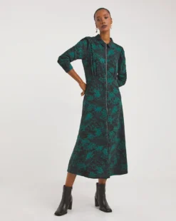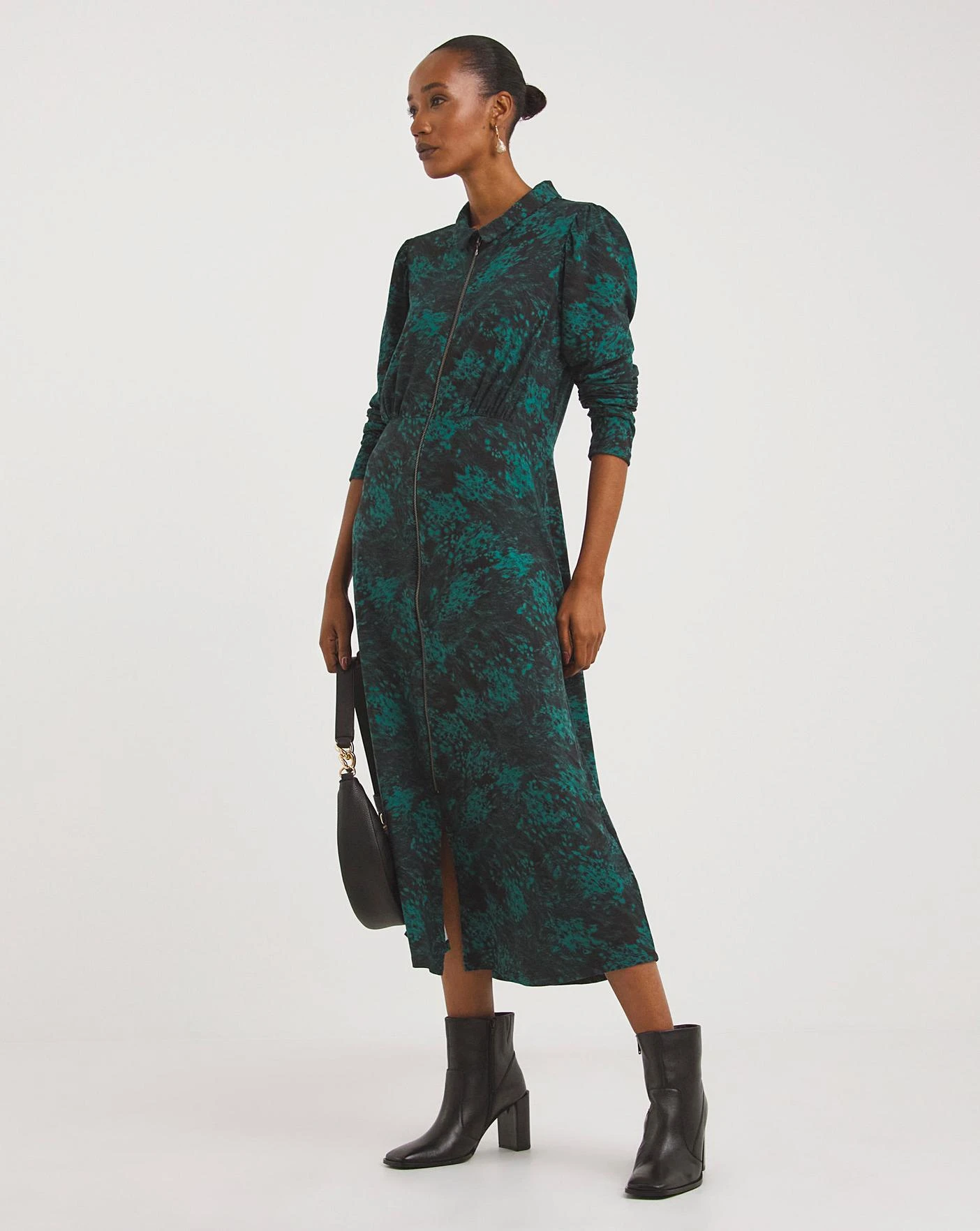 Designed using our best-selling Soft Touch jersey fabric which is sustainably sourced, you will love the super soft feel of this fabric! This modern shirt dress is a customer favourite and now available in the new season teal print colourway. Featuring gently puffed long sleeves, a longline zip, and flattering empire waist seam.