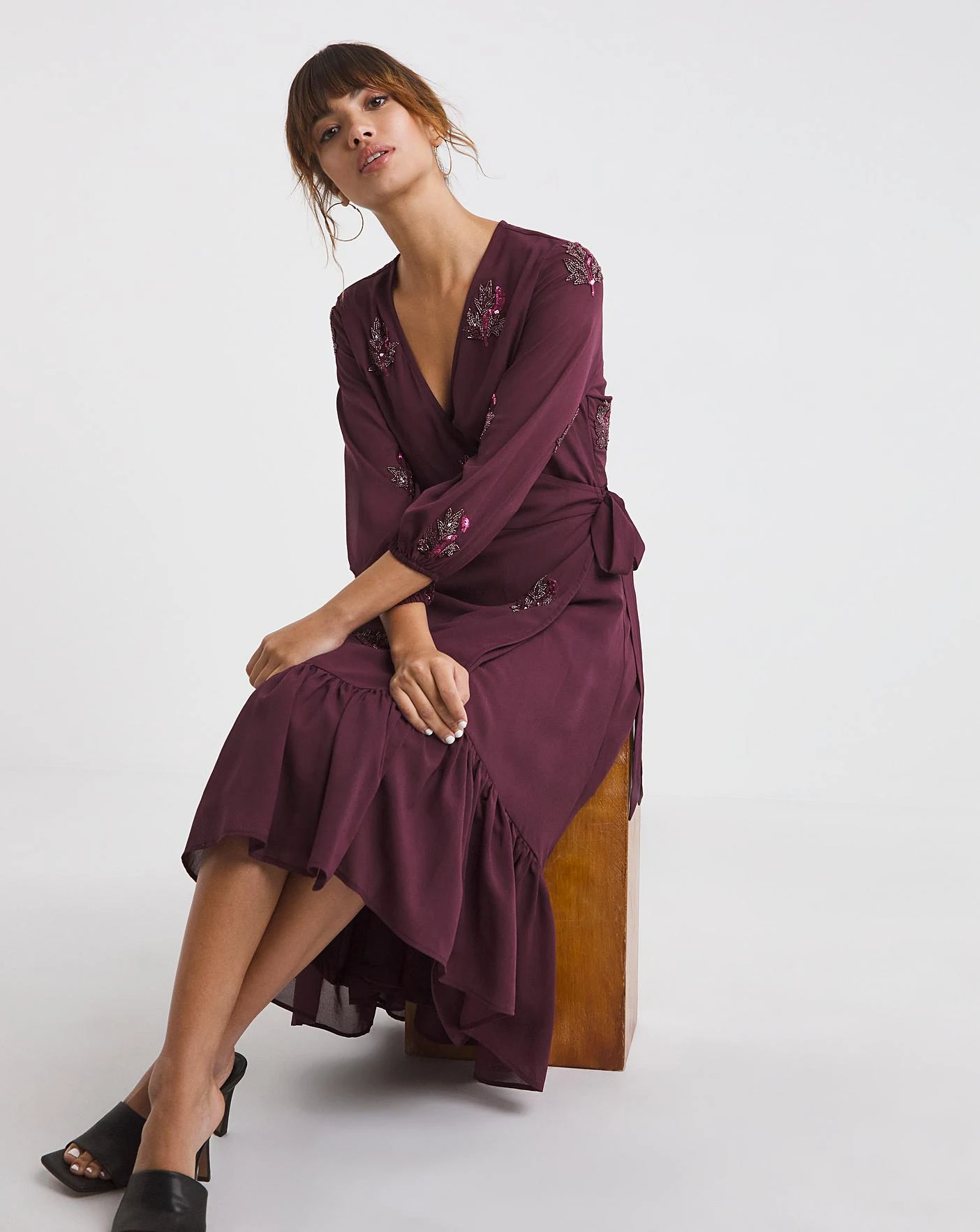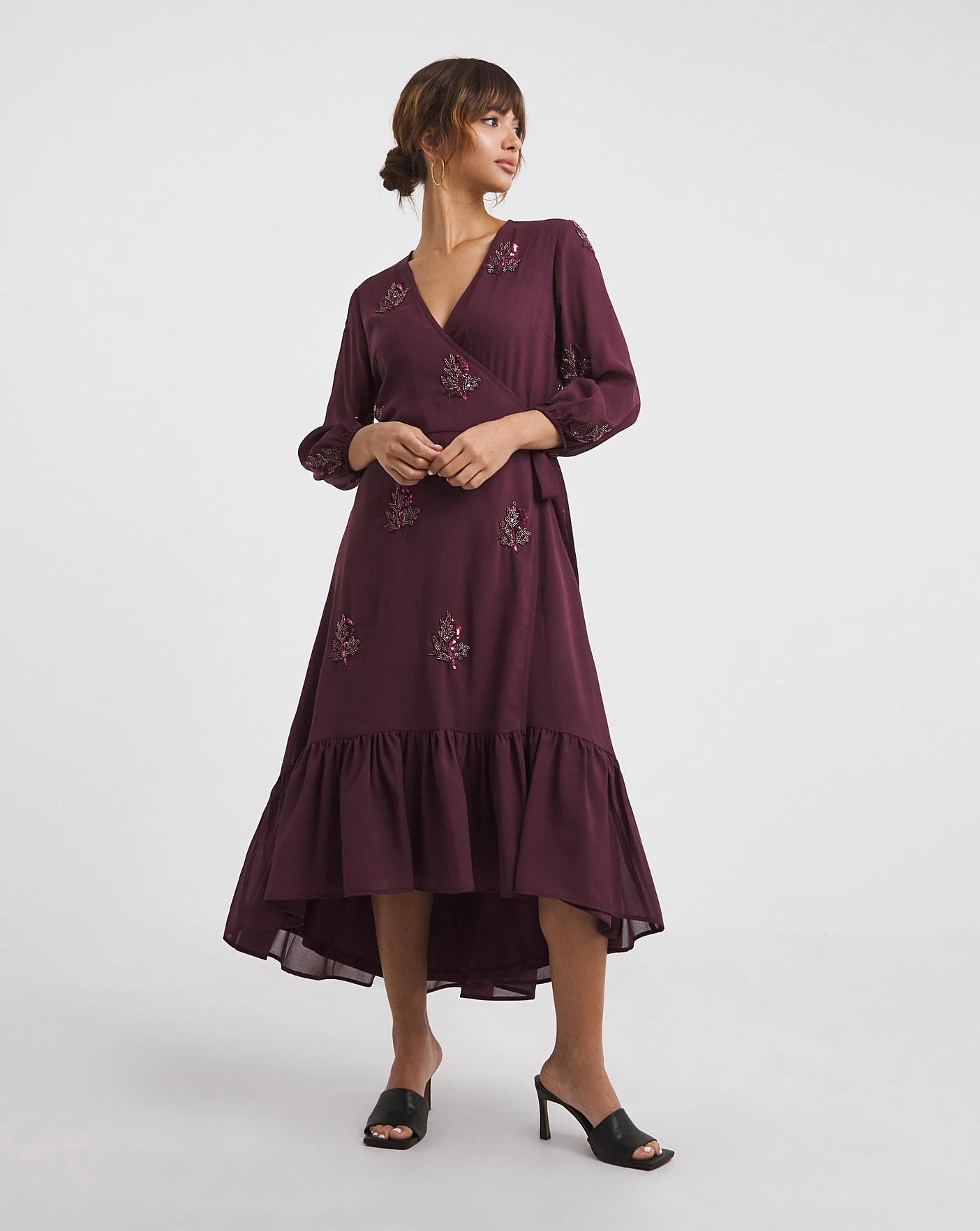 This beautiful georgette wrap dress features delicate embellished motifs and tiered frill at hem.