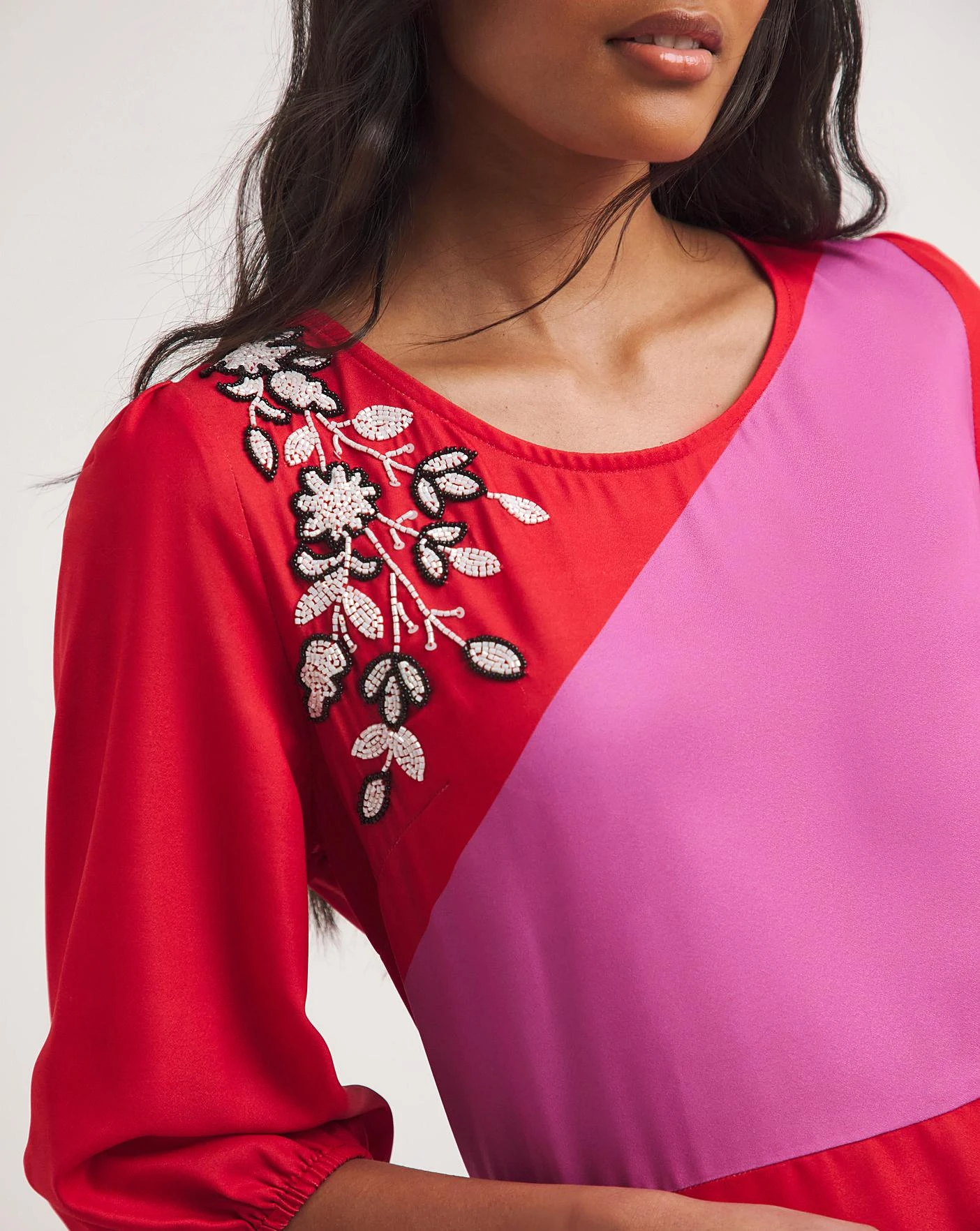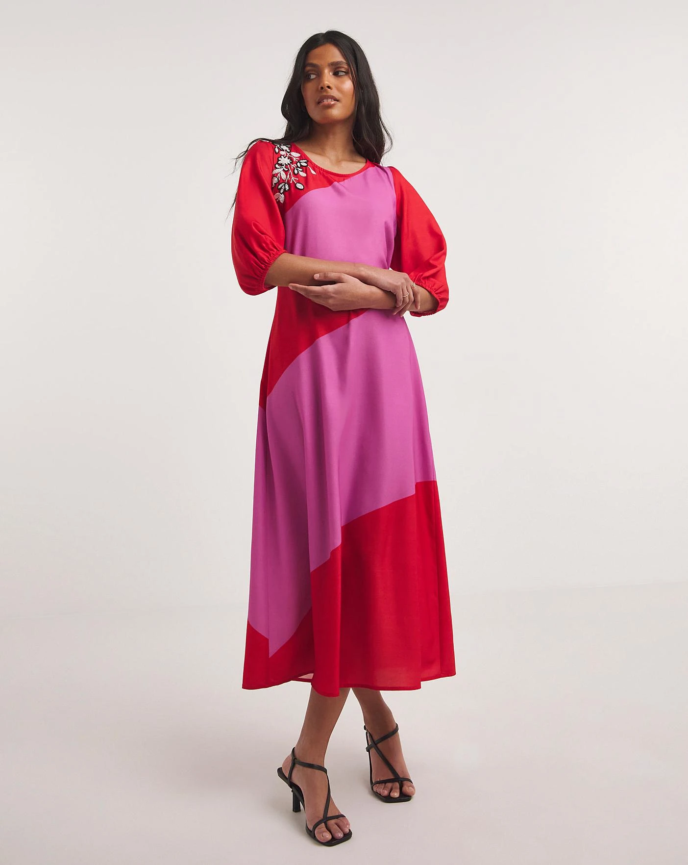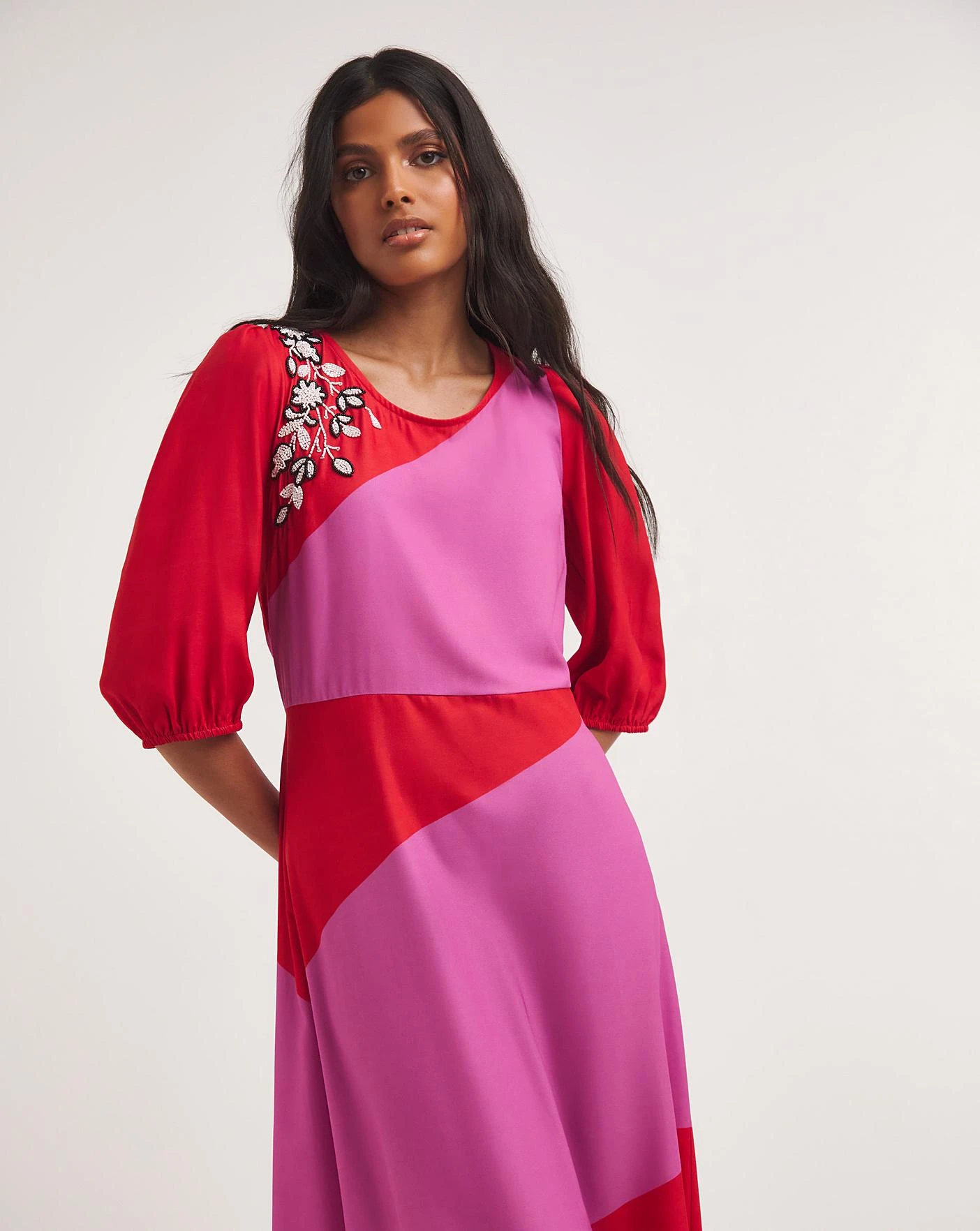 Incorporate some colour into your wardrobe this season. The bright pink and red creates a playful and bold look. The midi length, three quarter length sleeves, and floral embellishment work together to further accentuate the vibrancy of this look. This dress is a great choice for weddings or parties this season.