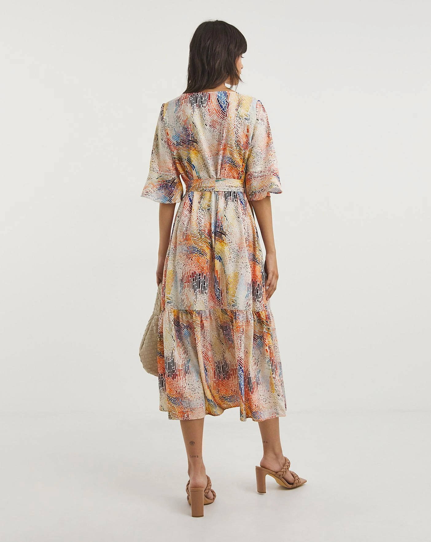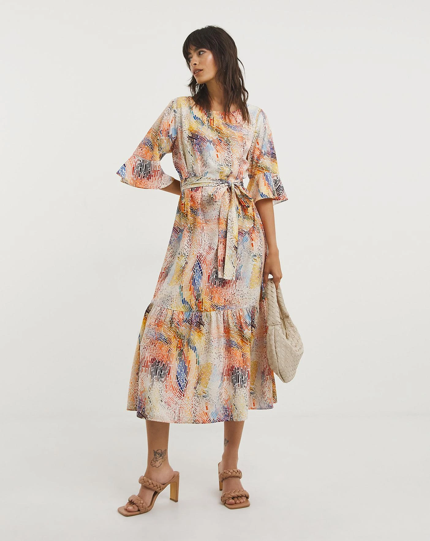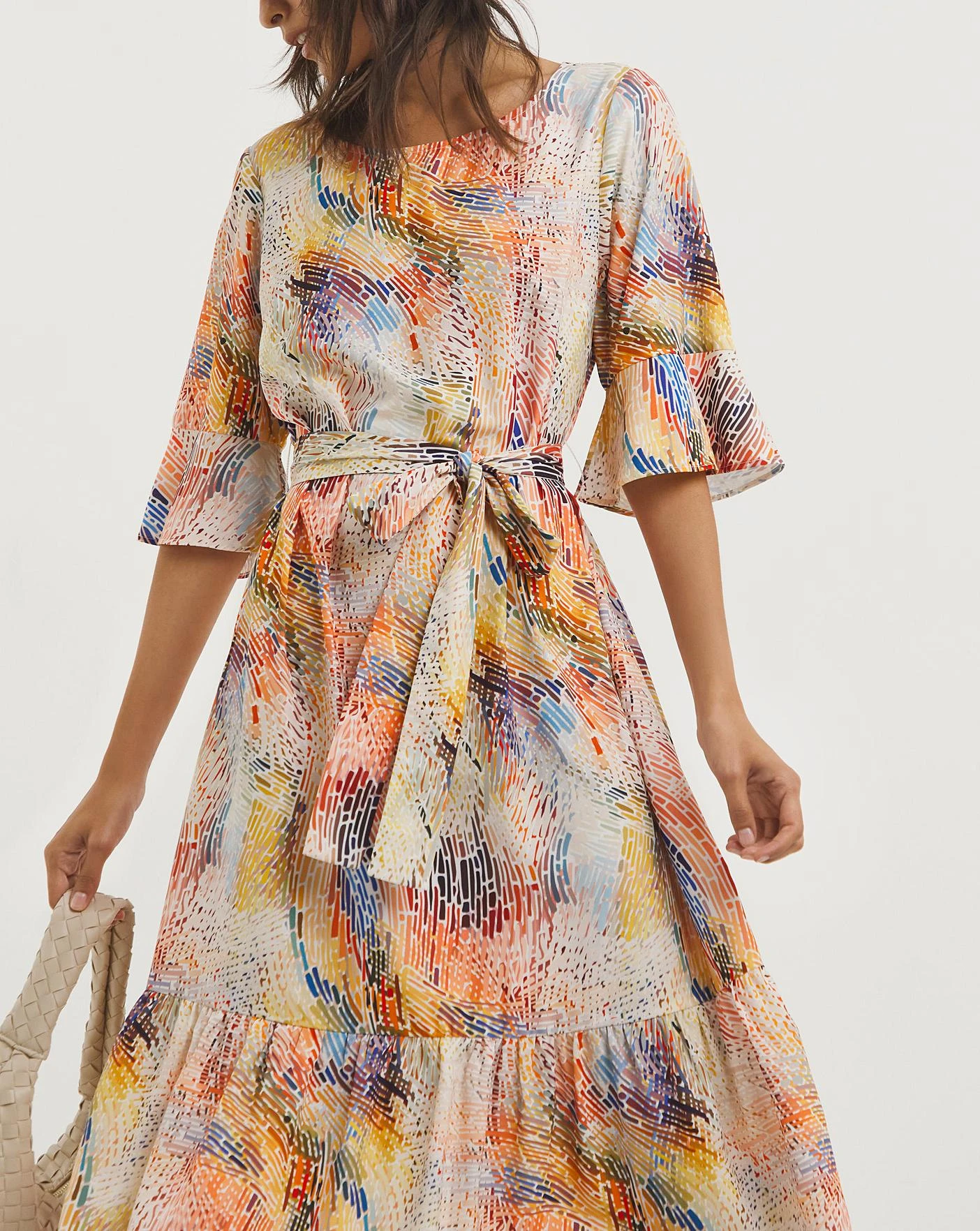 Bring a pop of colour into your wardrobe with this white, orange and blue dress. Featuring a tie up neck line, wrap cut styling and buckle belt detail.
