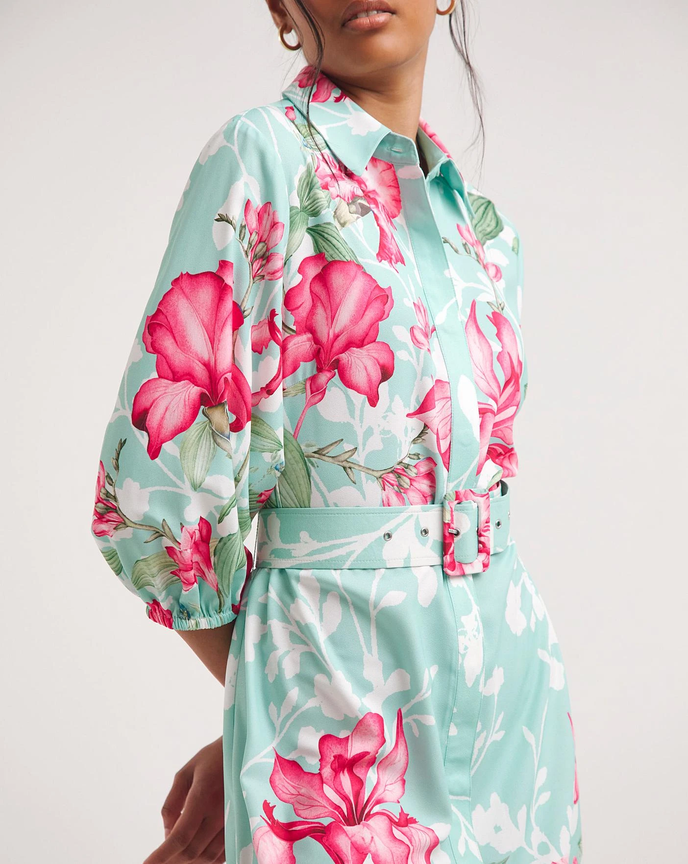 This sophisticated shirt midi dress features a bold pink floral pattern with a turquoise and white background creating a look that is both feminine and delicate. This dress also features an adjustable buckle belt, three quarter length sleeves, and a collar that adds a sophisticated look to the dress.