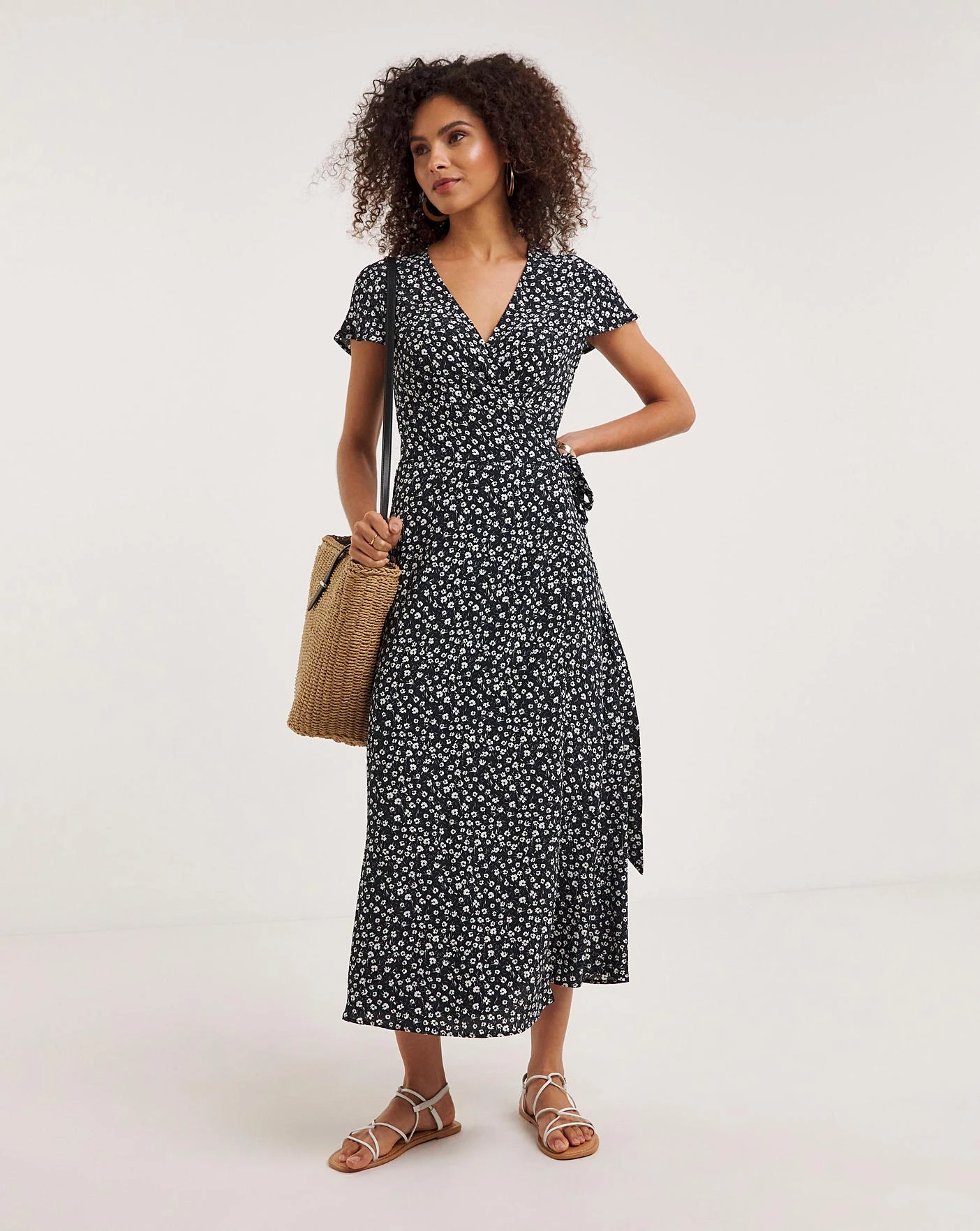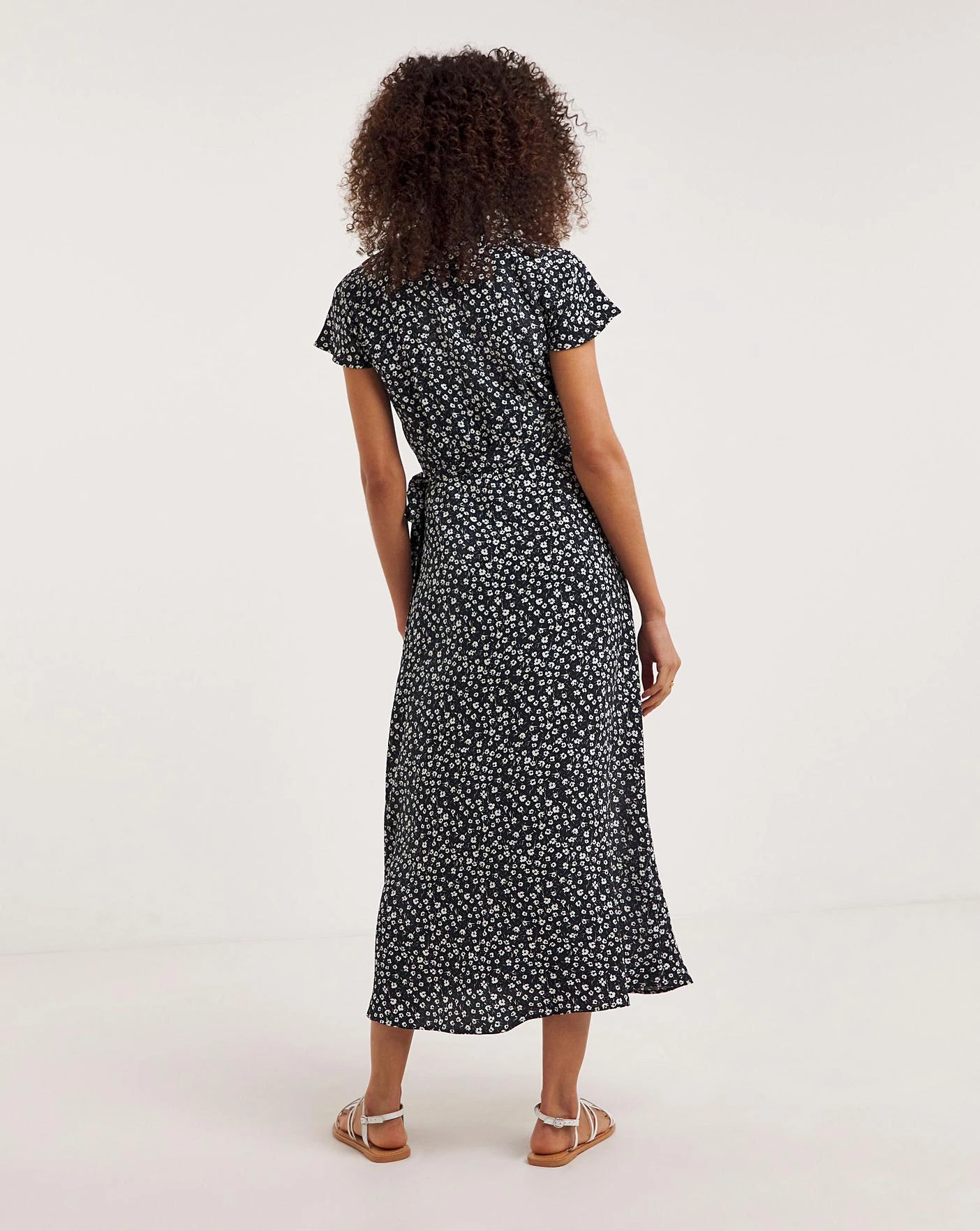 This wrap style midi dress features a feminine flutter sleeve and functional tie at the waist, allowing for a customizable fit. The floaty skirt adds a flowing, easy-wearing style to this versatile piece. Made from premium crinkle 100% viscose material, it pairs perfectly with white trainers for a casual, yet chic look. Layer up with jumpers for added warmth during cooler weather.