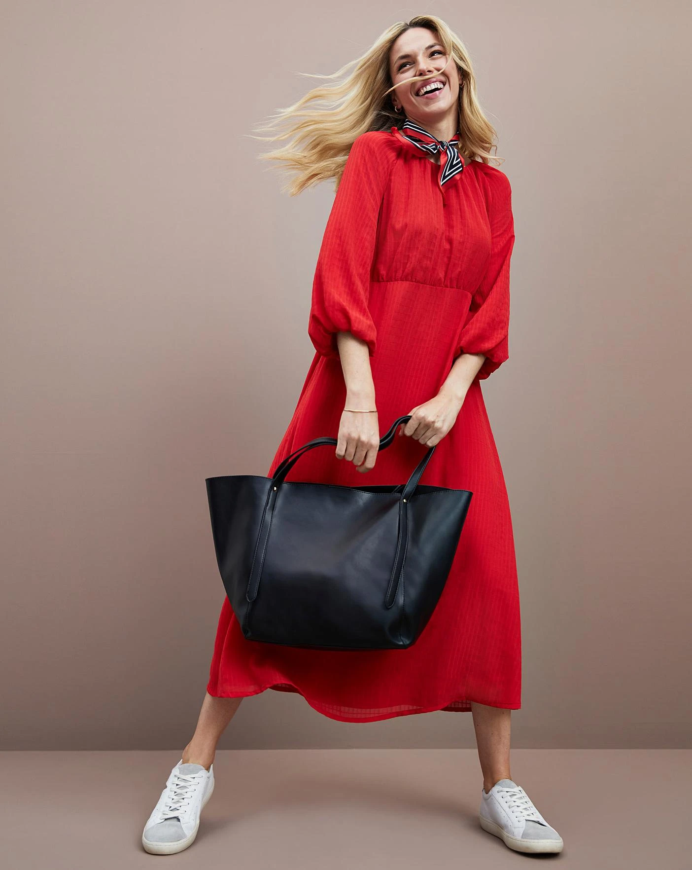 Our best-selling shape this season – this puff sleeve dress has been re-imagined in an elegant textured fabric, in a striking red shade. Featuring elegantly puffed sleeves with elasticated cuffs, a functional tie back neck for ease, and a shirred back panel for comfort. Combined with an airy silhouette, this gently checked woven fabrication ensures comfort and coolness throughout the day to night.