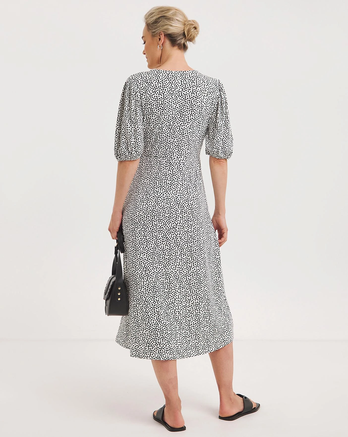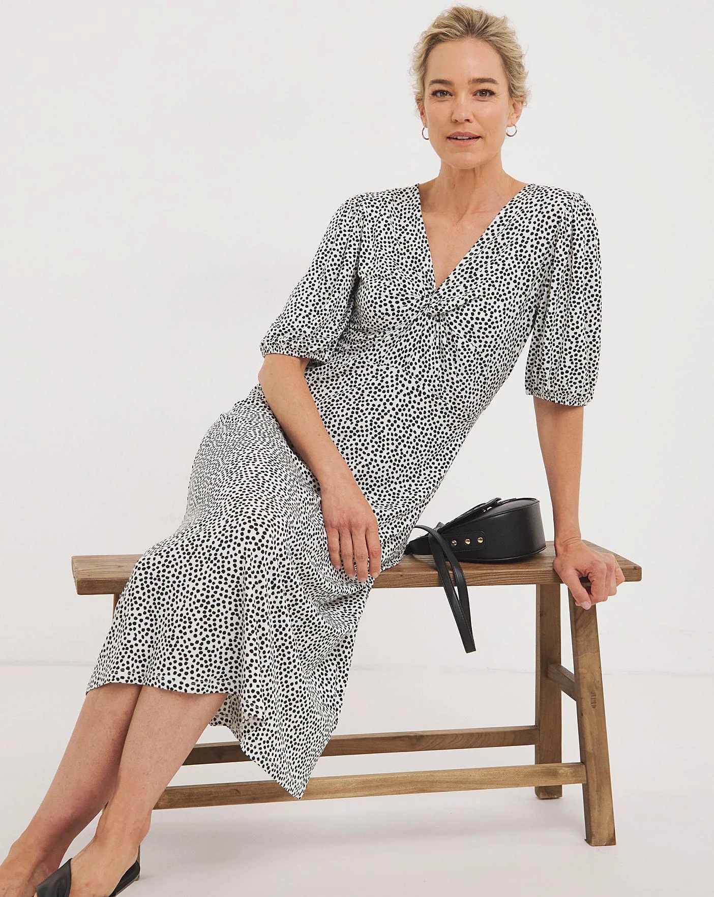 This pretty dress features a twist front detail and short voluminous sleeves. In a midi length, this dress is perfect for the summer season.