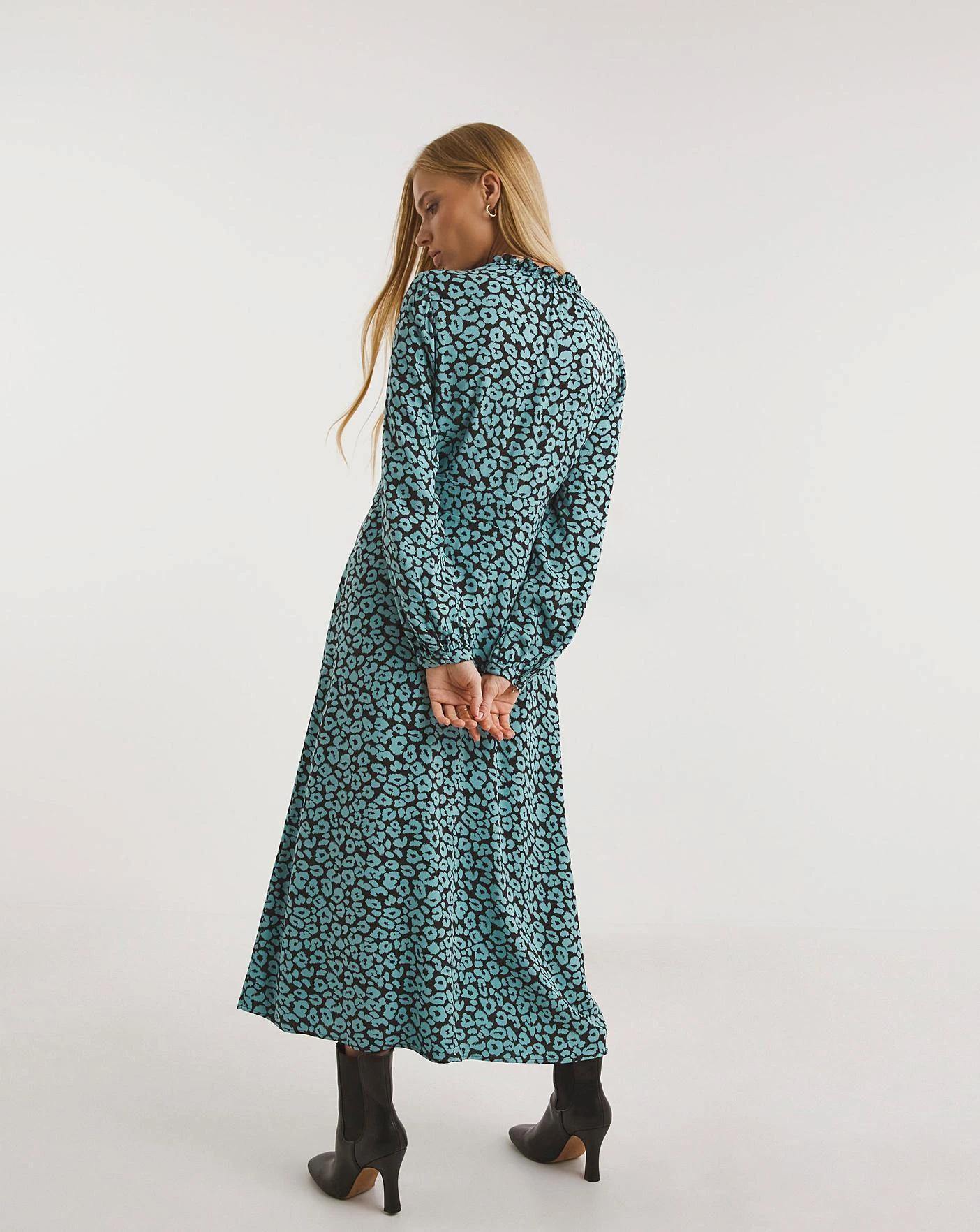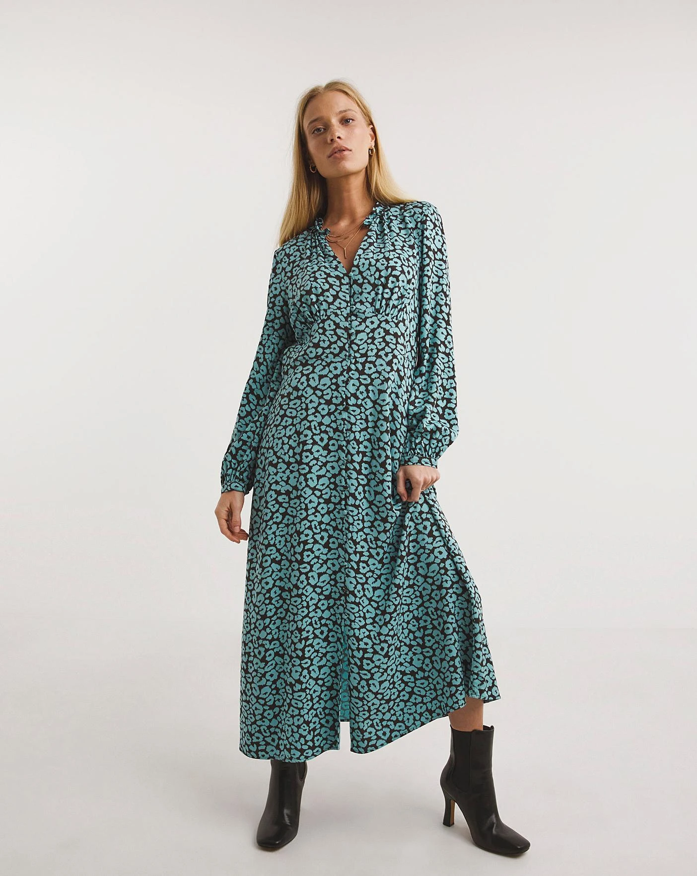 Crafted from responsible viscose, this dress is a regular fit midi dress accented with frill detail around the collar with buttons down front. Featuring a leopard print, boldly printed by hand.