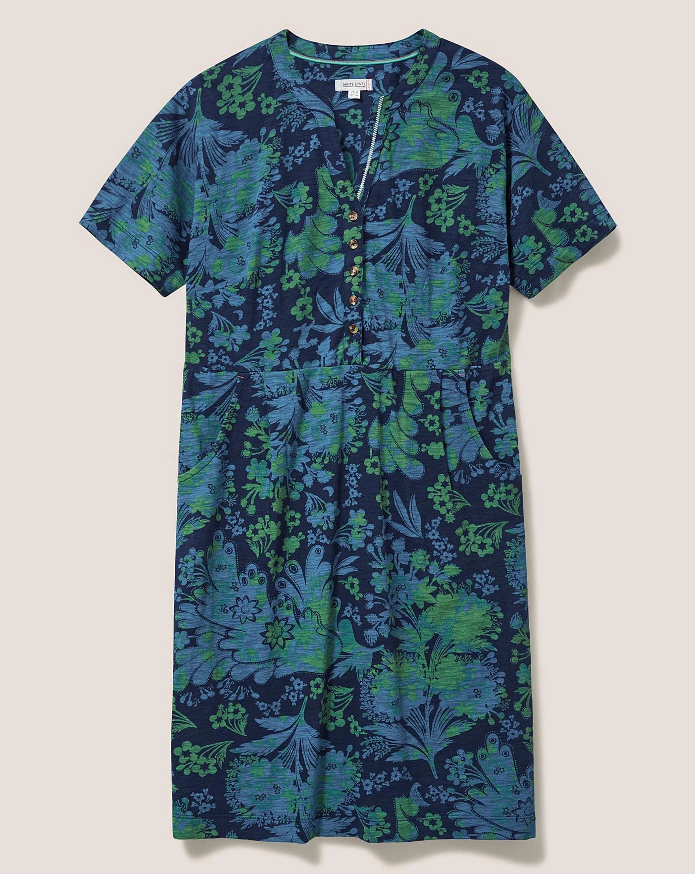 A short sleeve cotton jersey dress with a notch neck and pockets. It comes in different colours and prints, like all good wardrobe staples should.